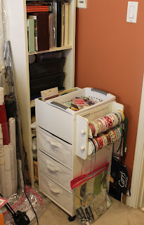 And the after shot. I switched things around and now that top drawer holds all my alphas (and my embellishments are in my old alpha bin). The little basket on top now neatly sits into the top of the unit and holds all my extra ribbon, embroidery thread and twine.