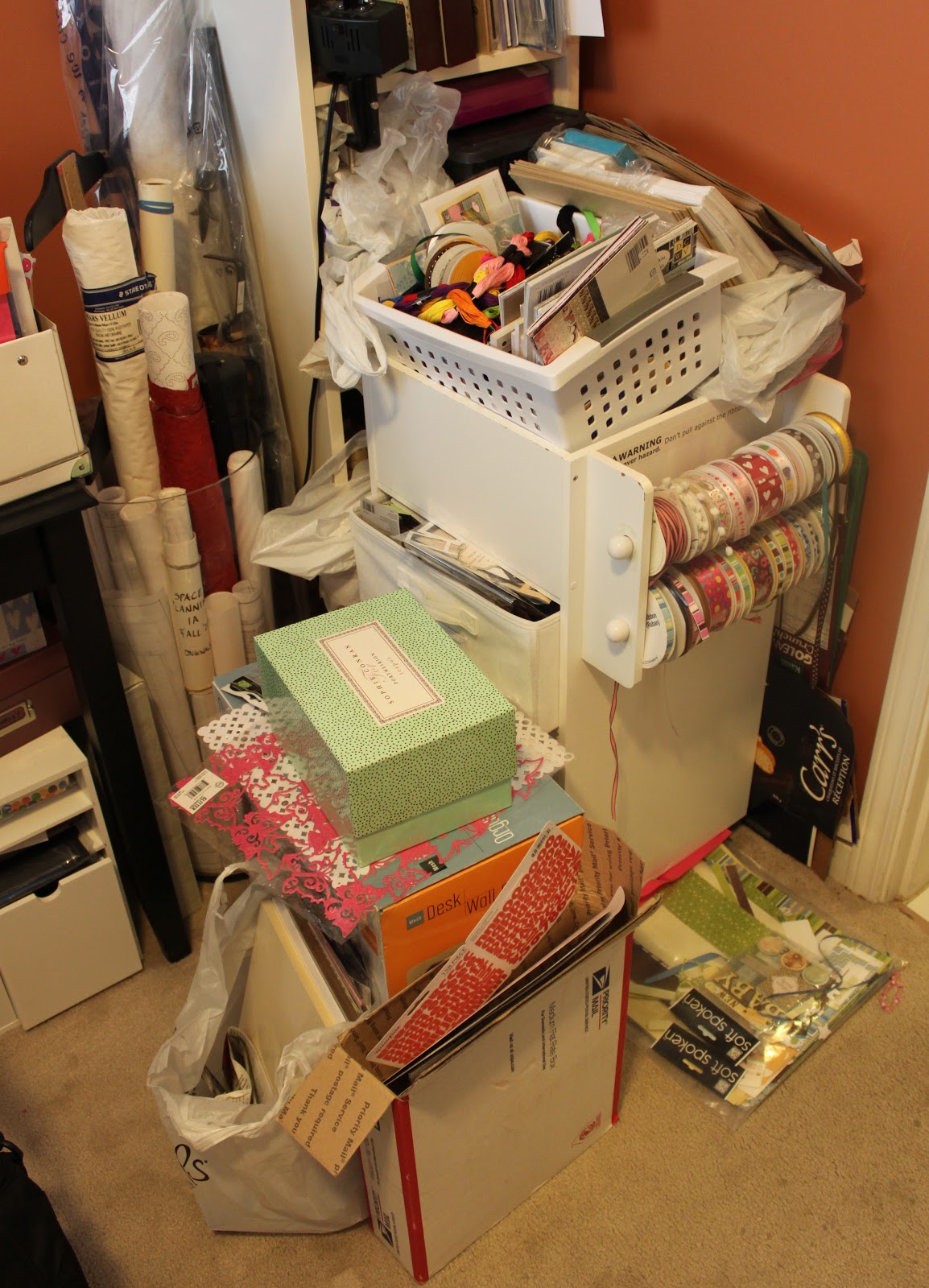 The before shot. This little unit holds about half of my paper (still to be organized/culled), embellishments, ribbon, and so many other little bits and pieces it’s hard to name them all.