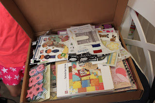 And last but not least I borrowed an idea from Lain – to have a box by your desk and as you come across something you no longer want/need you pop it into the box. Once the box is full  you send it on to a friend or give it to someone in need who can make good use of it. This is my box o’ goodies which I think I will hang onto until September and give to Paige’s Kindergarten classroom.