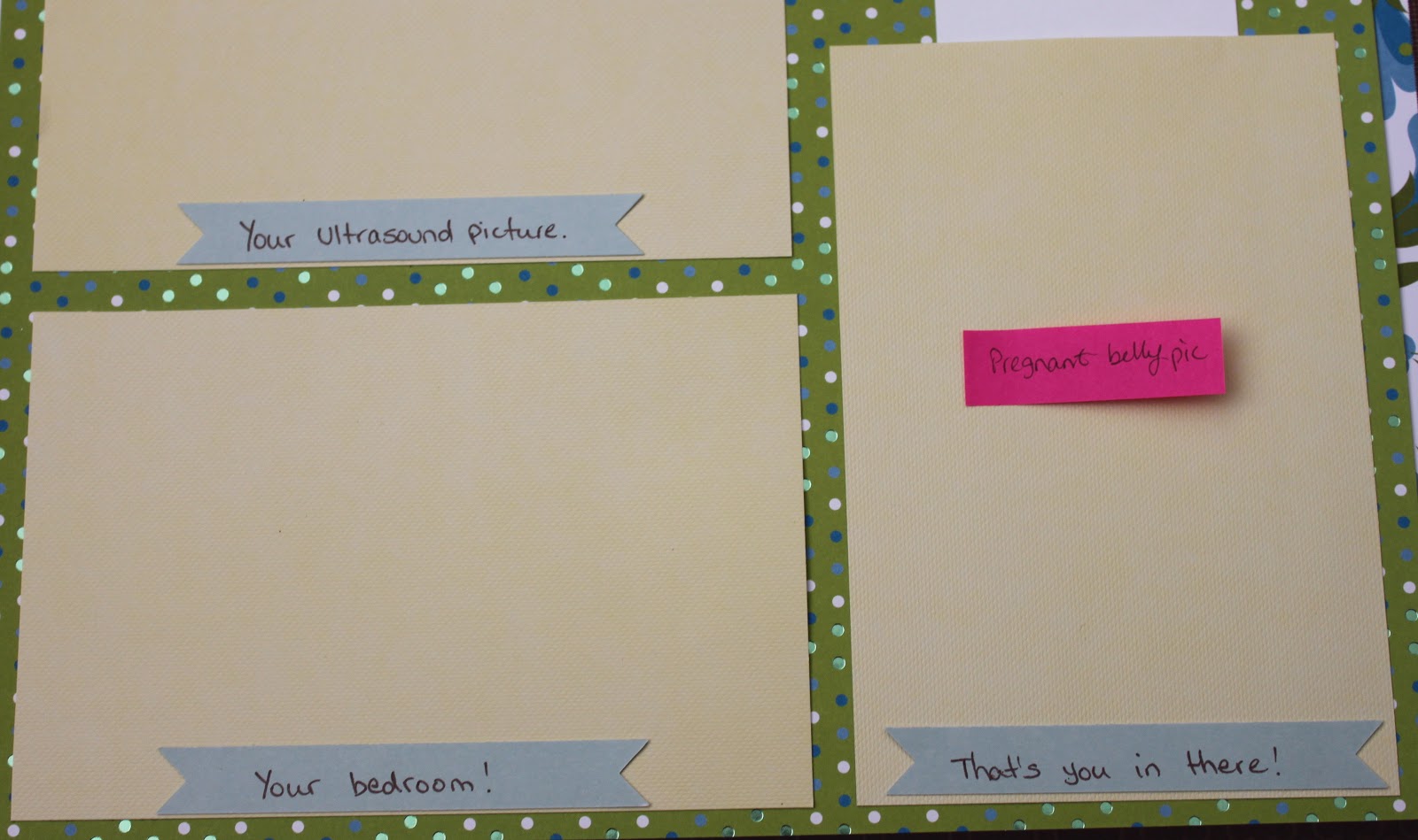 I’ve used these banner tags on other pages but left them blank. Here though I had a specific vision for the page so decided to go ahead and write little captions on each. The top left one if for an ultrasound picture (or more if they’re small), the one below it is for a picture of the nursery and the one with the pink sticky on it says ” That’s you in there!”. Kari insists she’s not going to be taking any pictures of her baby belly but I hope she changes her mind!
