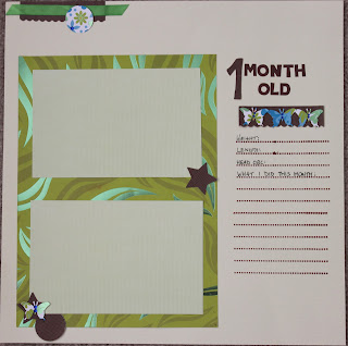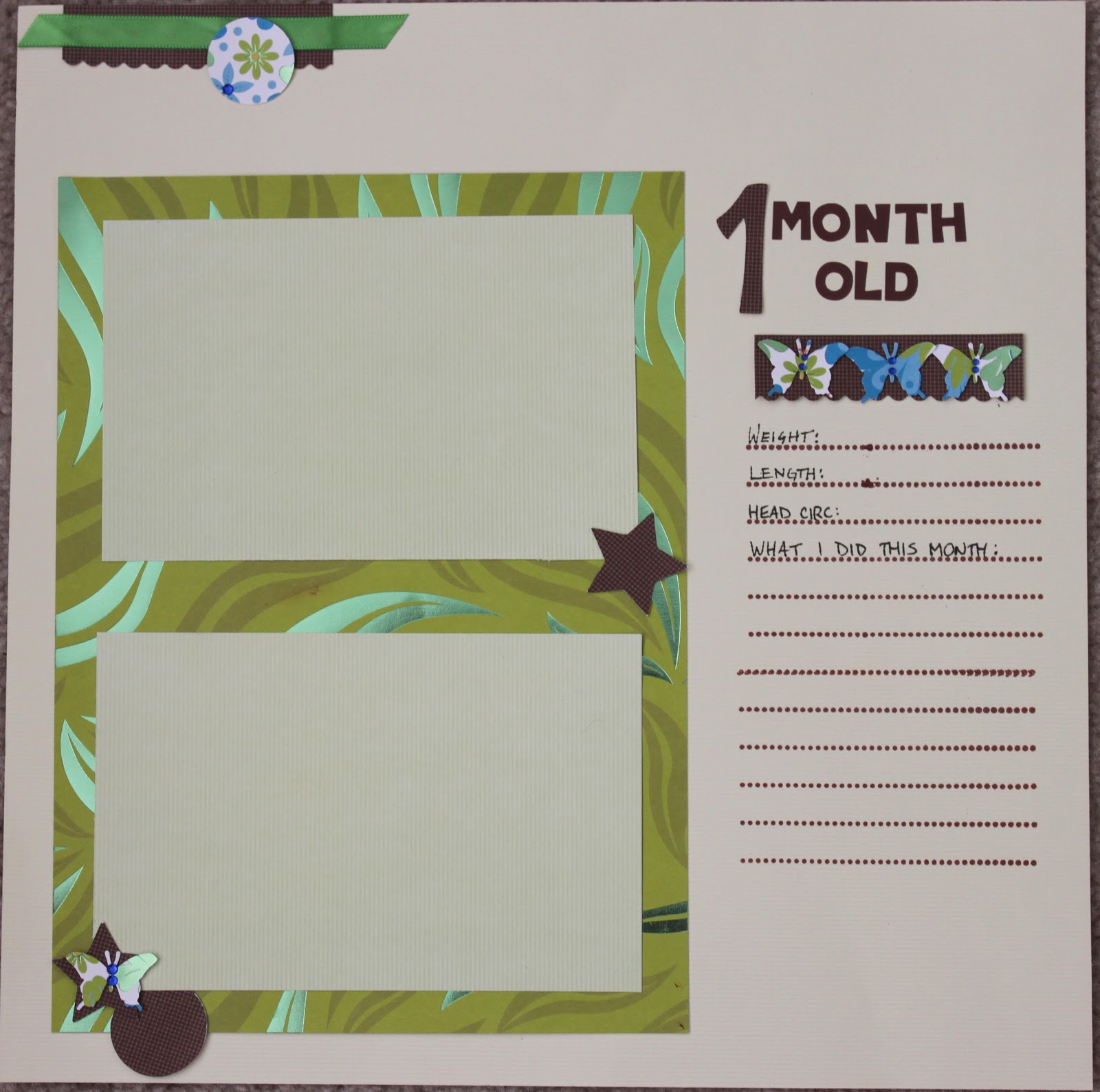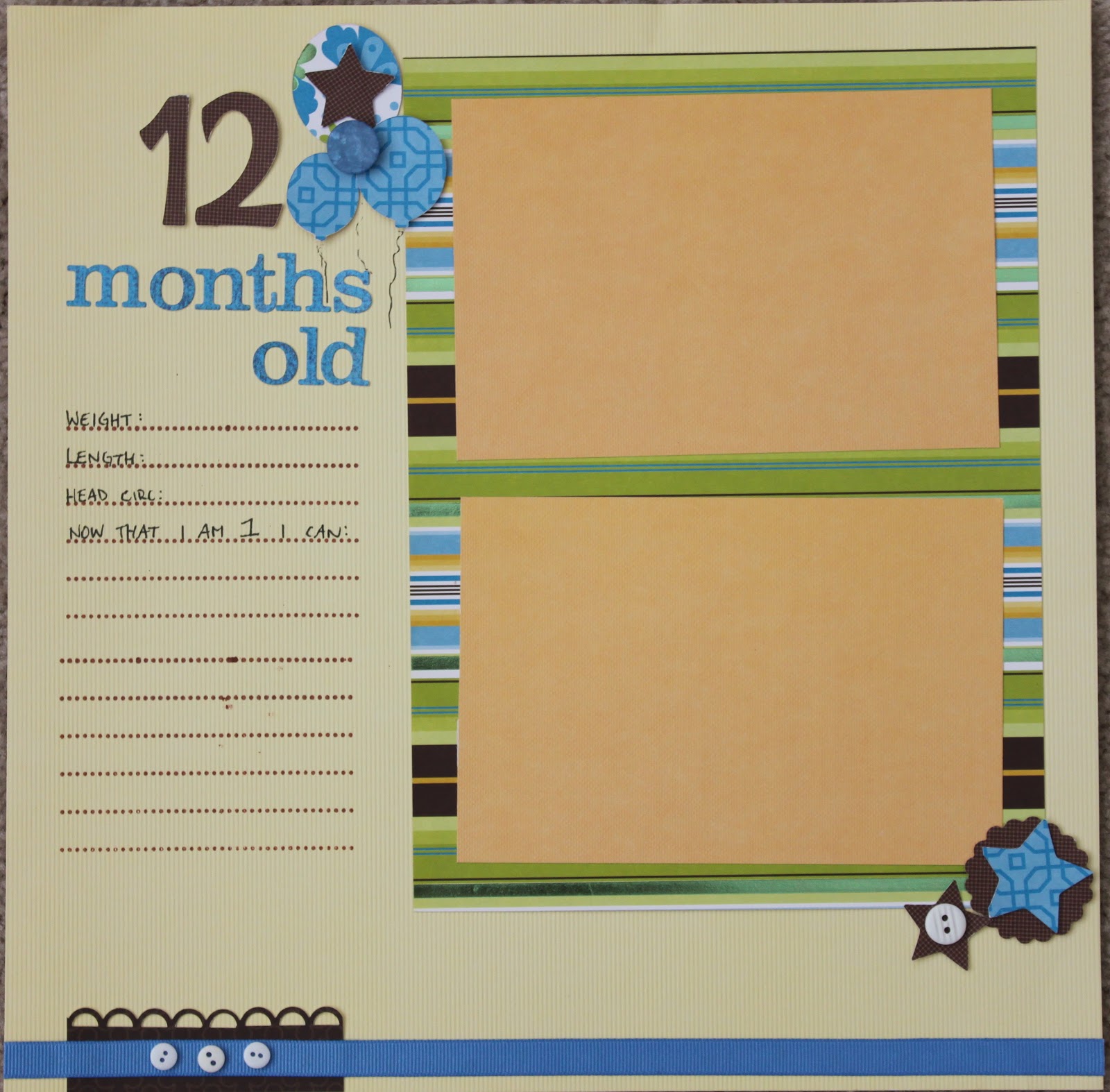 Supplies used in this album: (I’m sorry but I forgot to note the album itself. I got it at Michael’s and it’s a 3-ring binder style. Maybe Recollections?) Patterned paper all came from a DCWV pad – the Green Tea Stack. Cardstock was a combination of what was in my stash and some from an ATD 12×12 cardstock pad in pastels. Alphas (I used a whole bunch of different types): Basic Grey, Making Memories – Toil and Trouble corrugated brown and Sticker Shimmer Alphas in Diva Dark Blue, Recollections, Frances Meyer, Thickers – yellow vinyl, white glitter, bronze glitter (Dear Lizzy), and Scenic Route chipboard alphas in brown. Embellishments: Martha Stewart Ribbon Style tags, mostly Basic Grey buttons, MS Findings in Turquoise, various Celebrate It ribbons, MS Blue Felt Boy Borders, Recollections baby boy stickers, Me & My Big Ideas stickers – Kay Baby Boy and FD Brand New Baby, Little Yellow Bicycle 10 things Pocket – Baby boy, MS Leaf Flourish labels and Calling Card labels, MS Grosgrain bow stickers, and Staples tags in white. Punches: MS Punch all over the page Classic Butterfly, MS Butterfly stamp and punch, EKSuccess Open Scallop edge punch, MS Bubble Bath punch around the page punch. Last but not least, the month numbers and the stars and balloons (on Month 12) were cut out on my Cricut using the George Basics cartridge.