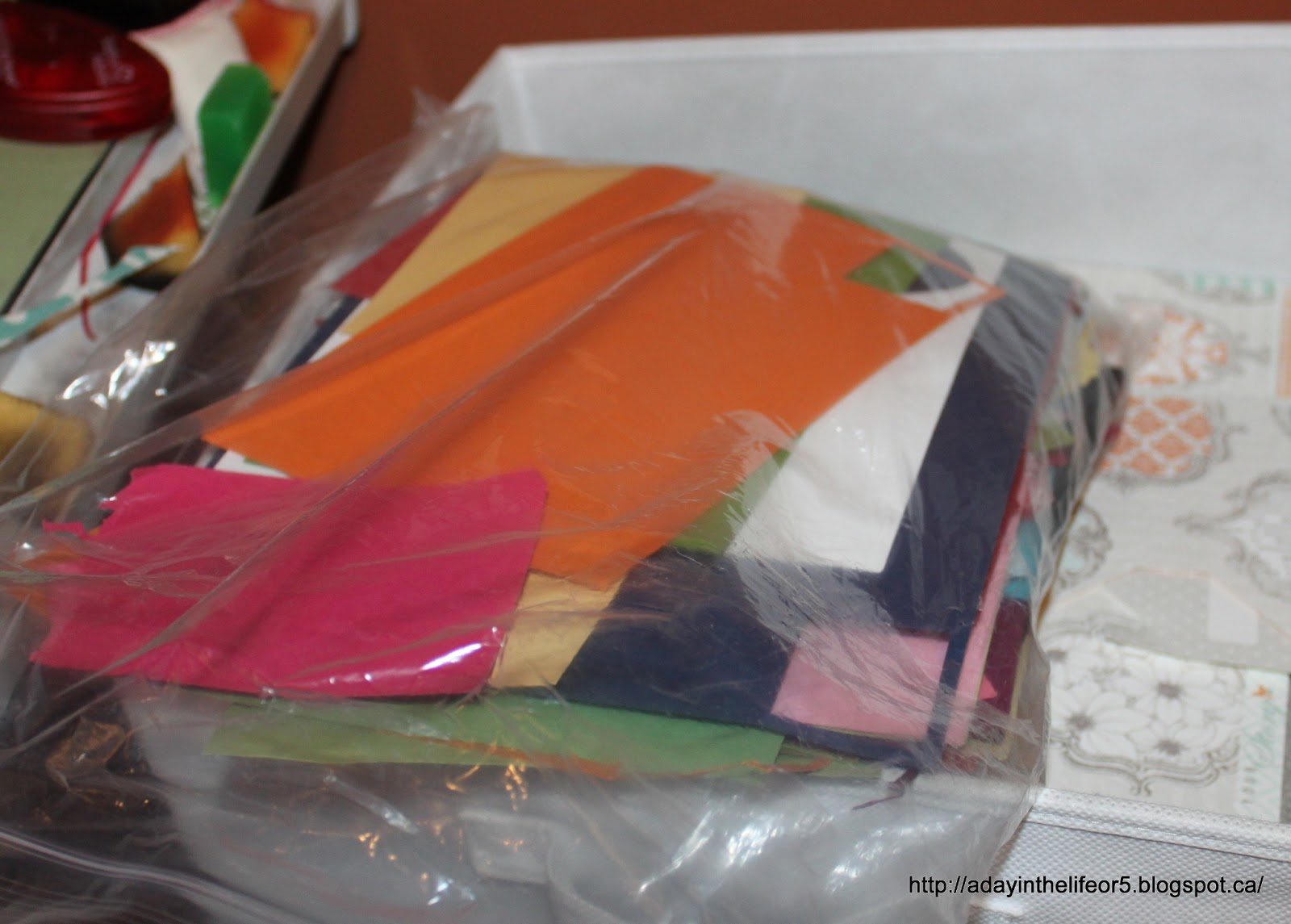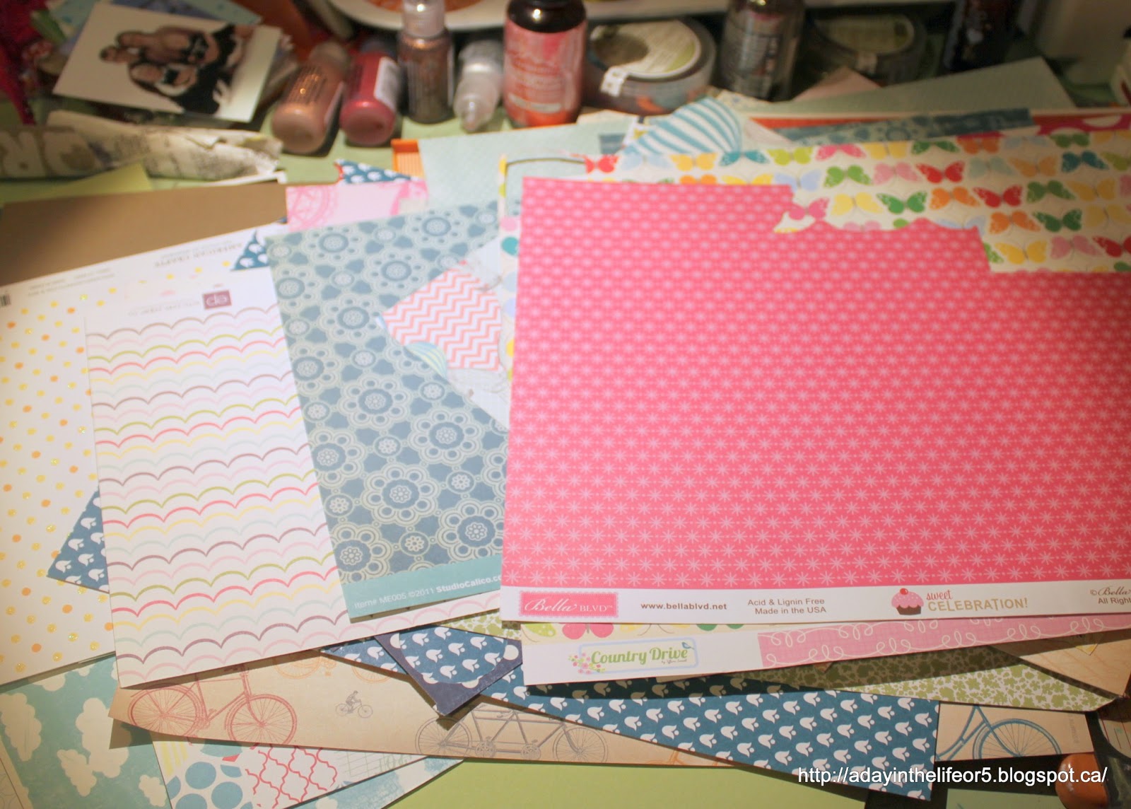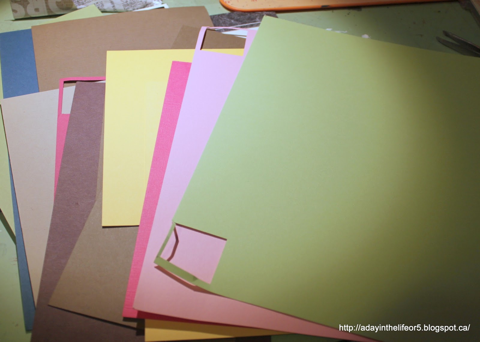 After going through all my scraps, I pulled out several large pieces of card stock in colours that made me happy. No thought was given to colour matching at this point.