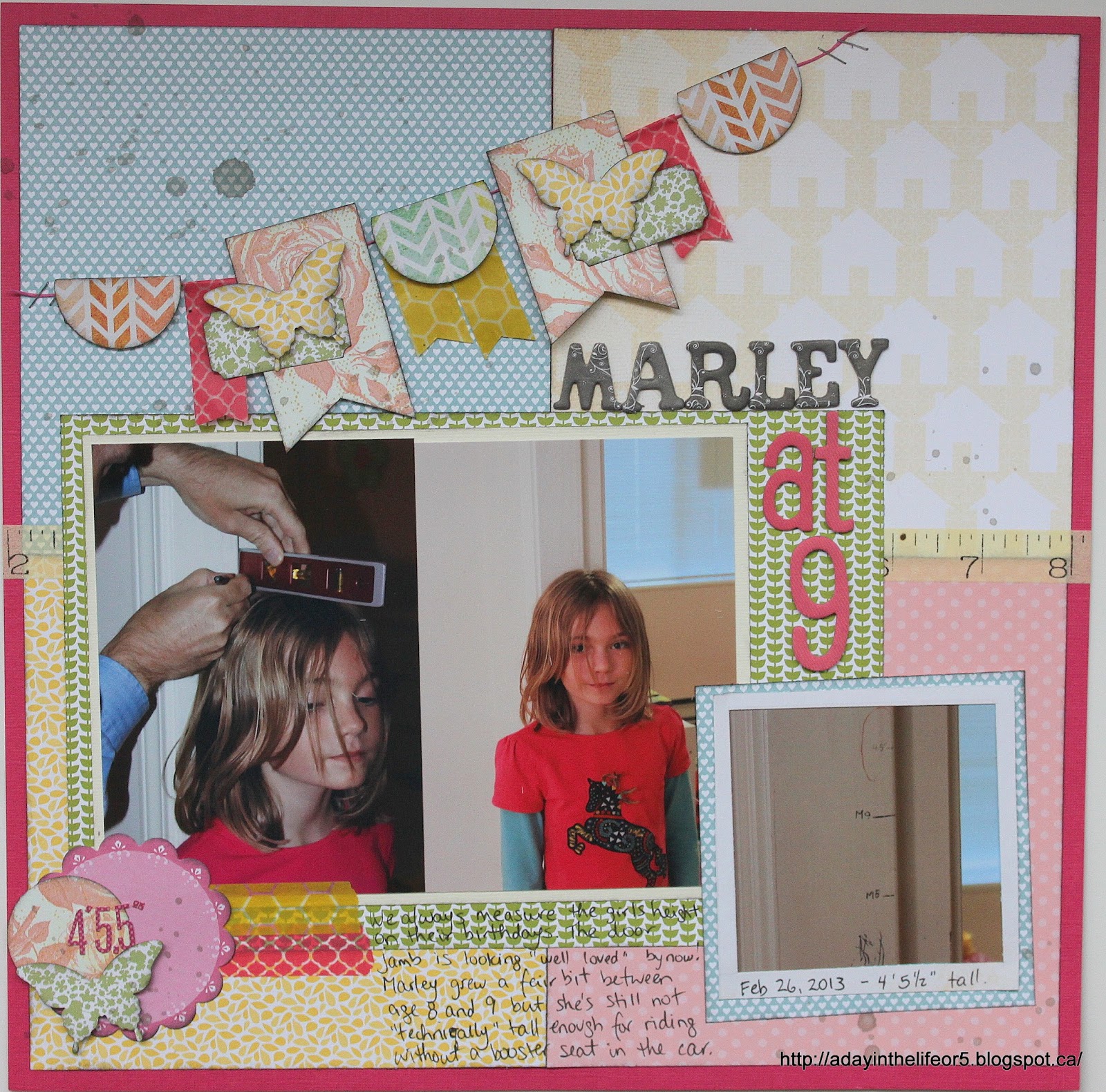 Usually I plan where my journaling is going to go before I get too far into the process but this time I got sort of carried away and forgot. Whoops! I am not totally in love with how it looks but the more important thing is that it got on the page! This is one of those types of pages that I’ll make a new one of each year – the annual measuring of the birthday girl – so I don’t anticipate what I say will change too much over the years. “Oh, how you’ve grown!” can only be said so many ways before you start repeating yourself!!
