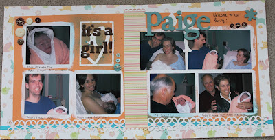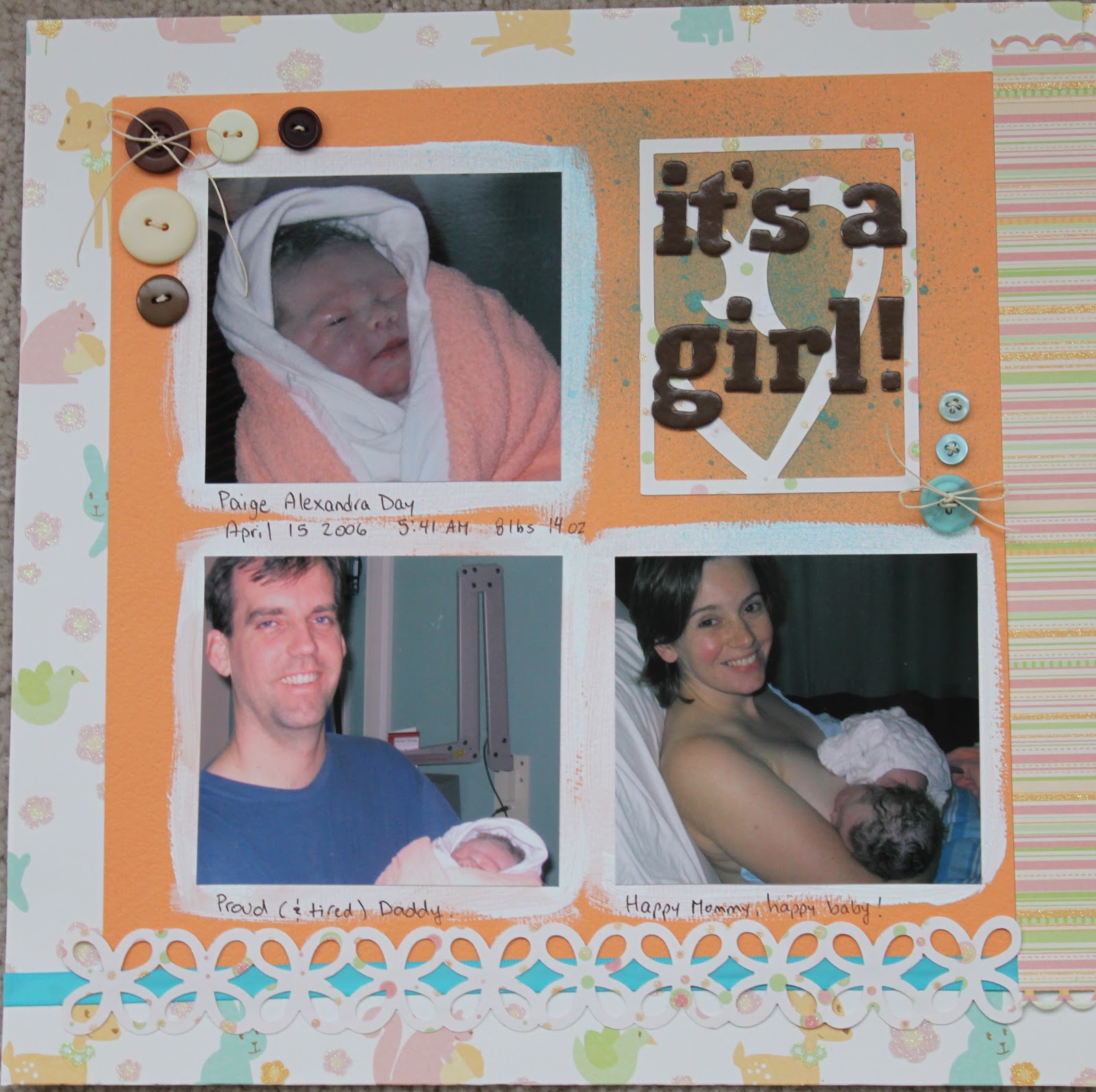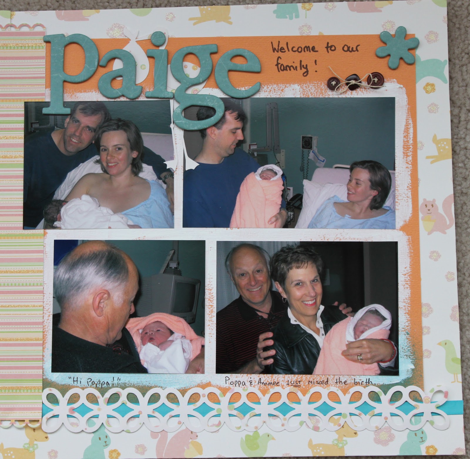 This also coincides with the official start of Paige’s Baby Album. Something she has been bugging me to do for ages! Now that I’ve finished the Maui album I feel ready to tackle this project. So, scrapping friends, expect a lot of baby themed pages featuring a thinner, younger me! Sigh!
