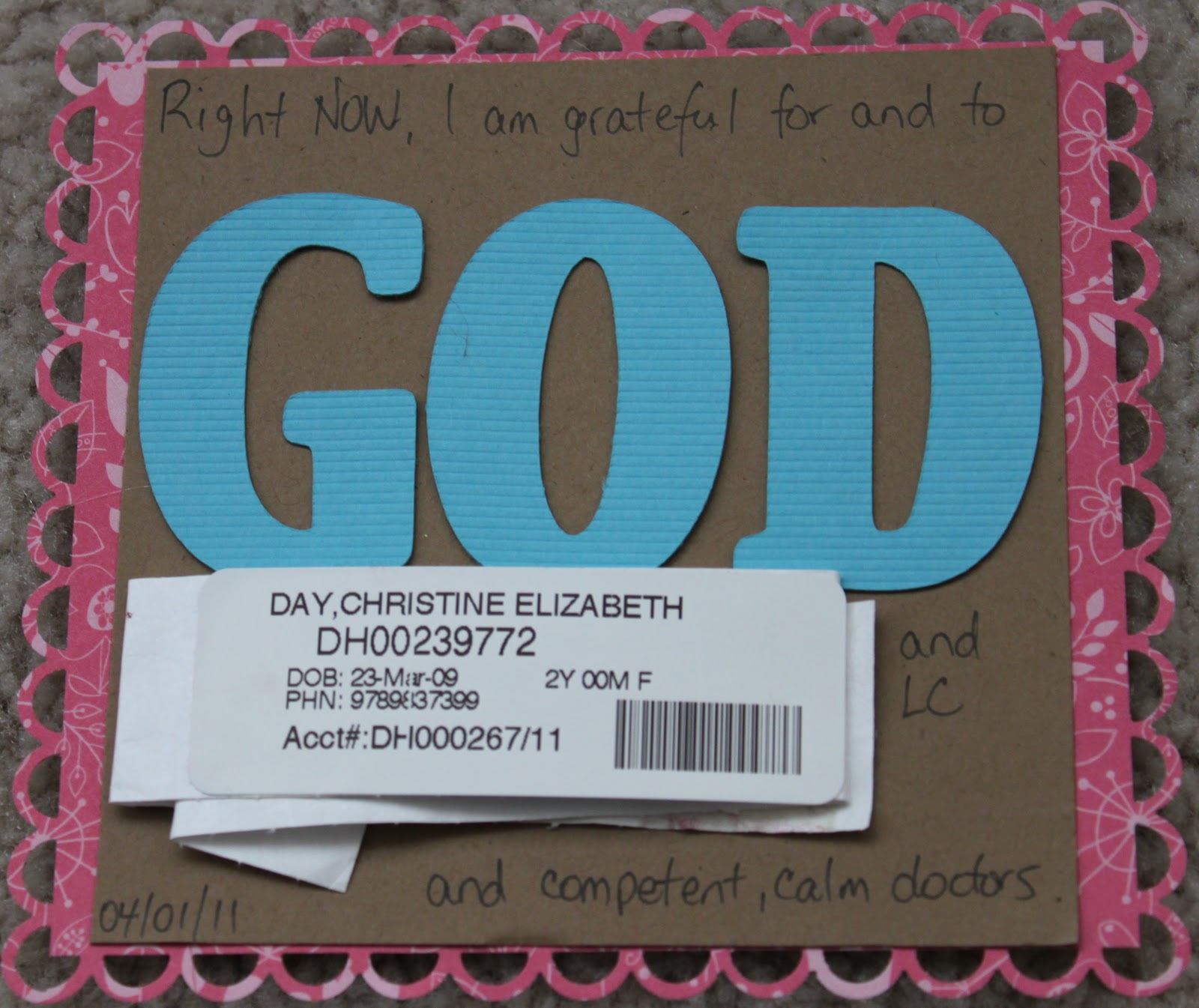 Next up, Day #22 – scrap something you are thankful for. This came easily but is not a layout. When I sat down to do this one I had just brought LC back from the hospital. I confess that I dislocated her elbow in an attempt to remove her against her (overwhelmingly strong – wonder who she gets that from?) will from the office. I pulled on her hand, she pulled back and then dropped and I heard (and felt) a nasty popping sound. She cried a lot and then fell asleep so I wasn’t totally sure if I’d really done anything horrible. Until she woke up crying and not using her left arm at all. So, off to the local hospital we went where a very kind (and tired looking – I wonder if he was pulling a double shift?) doctor gently twisted and bent her arm up. She cried again but about 2 minutes later ran over to the toys in the waiting room, hauled herself up on the chair using both arms and started pulling all the books out of the basket. All better!