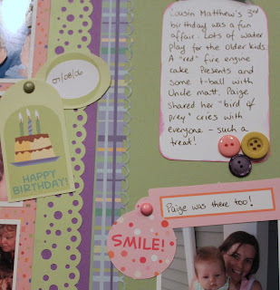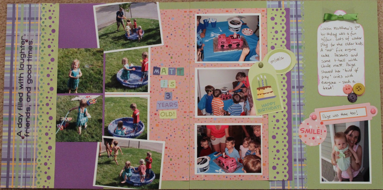 I’m still digging into those old pictures from when Paige was a baby so these are of my nephew Matthew’s 3rd birthday. In Marley’s baby album I have a layout of Matt’s 1st birthday but I’m thinking I may pull that out and make a separate album for birthday layouts. ‘Cus really, Paige wasn’t a player in the action here just as Marley wasn’t 2 years before so why should these layouts be in their baby albums? We’ll see. Work in progress, as the saying goes!