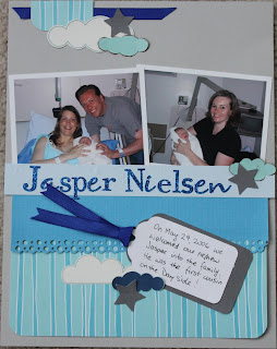 Products used: Grey cardstock base – Recollections 81/2 x 11; Striped patterned paper and the clouds – Bella Blvd Flirty and ??; Grey paper for tag and stars is AC but I don’t remember the line; Labels – cut out on my Cricut using George Basics; Ribbon – Michael’s Celebrate it grosgrain; Alphas – Making memories Cheeky Shimmer Stickers in dark blue; punches – corner rounder and MS Bubble Bath.