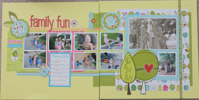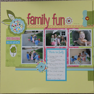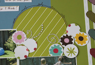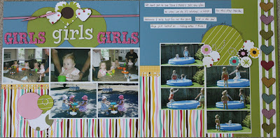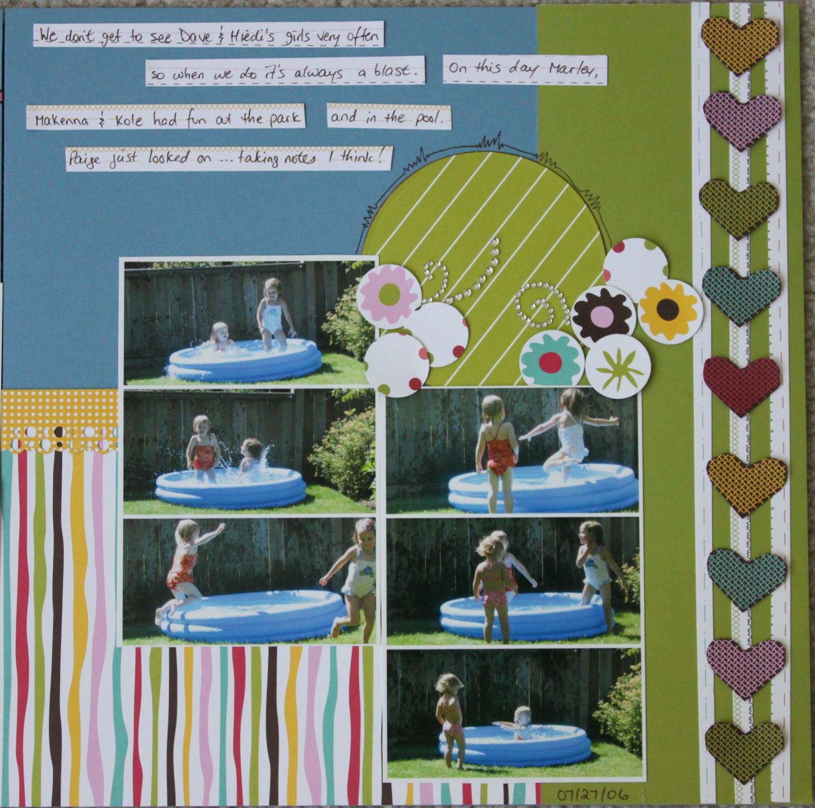 I’ve had a ton of fun rediscovering and using my older papers and embellishments. A HUGE thank you to Lori for the kick in the butt to scrap and scrap and clean out my stuff. I found that since I’ve been actively working with my supplies I have really learned which products I like to work with, which styles I like to do and, more importantly, which I don’t! As I’ve been “forced” to use some older product I’ve made the decision to get rid of it if I’m not completely loving it. Paige’s kindergarten class is going to be getting a large box of stuff in September that I have decided I no longer want to play with!