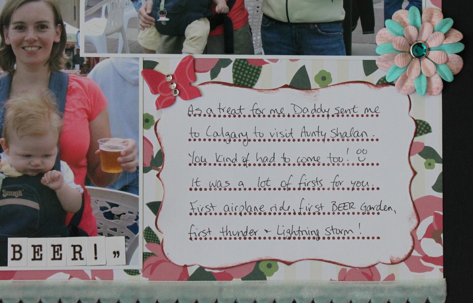 I swear to you these are Christmas Themed papers! They are from the Dear Lizzy line that came out last year. My newest, soft embellishments are the ribbons and the fabric flowers which, I’ll be honest, aren’t all that new but since my absolute newest ones were all cupcakes … these will have to do! Again, my layout, my rules!! LOL! Oh, the alphas are the foam ones which are both really new and very soft. So there!