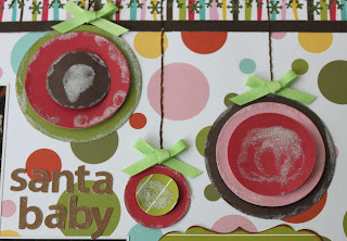 Oh, and don’t you just love my Christmas ornaments? Some circles cut on my Cuttlebug with some glitter added plus hand stitched strings and a Martha Stewart bow sticker. Easy peasy!