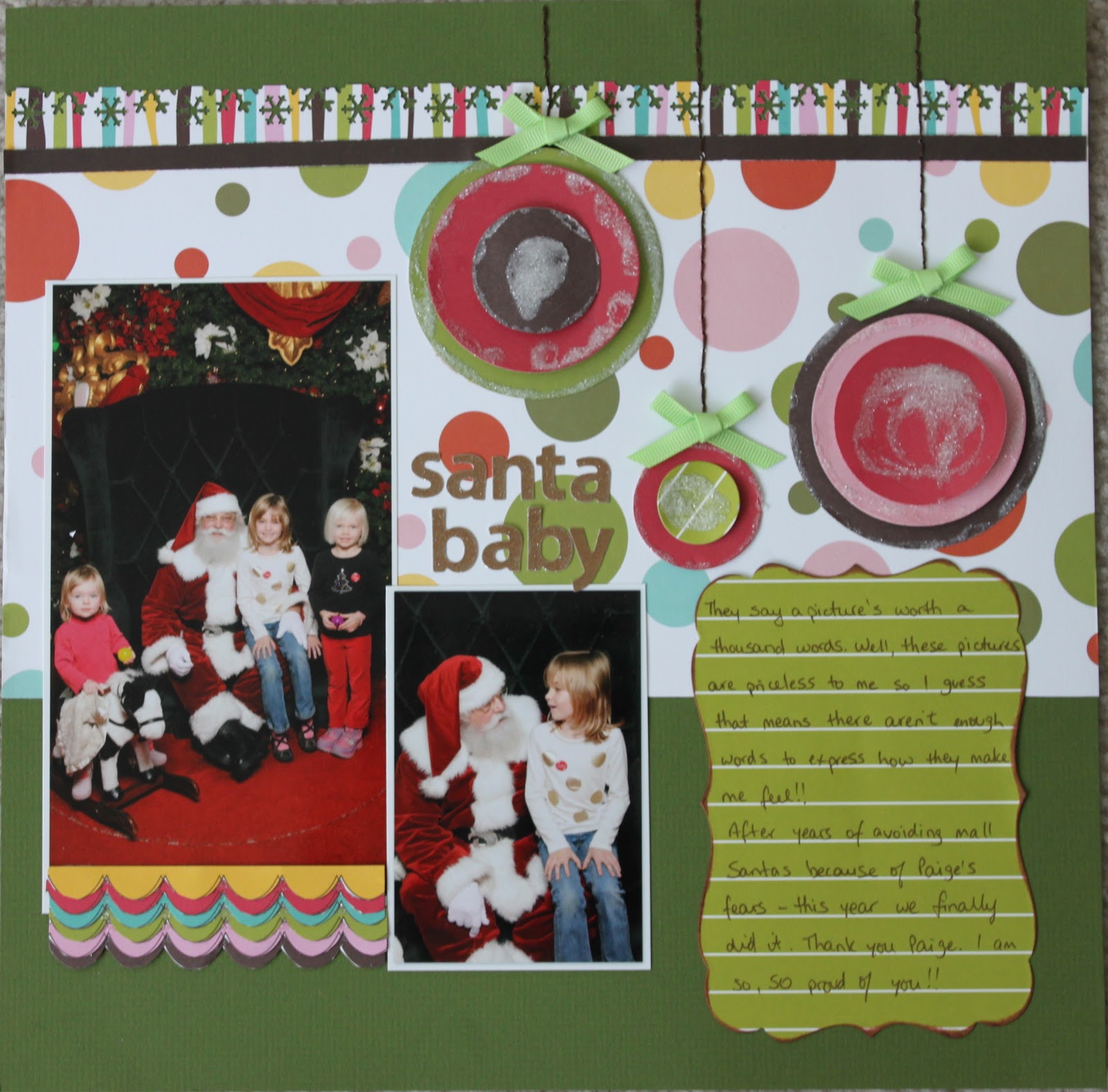 Journalling reads: “They say a picture is worth a thousand words. Well, these pictures are priceless to me so I guess that means there aren’t enough words to express how they make me feel!! After years of avoiding mall Santas because of Paige’s fears – this year we finally did it. Thank you Paige. I am so, SO proud of you!!”