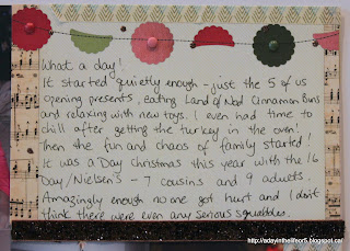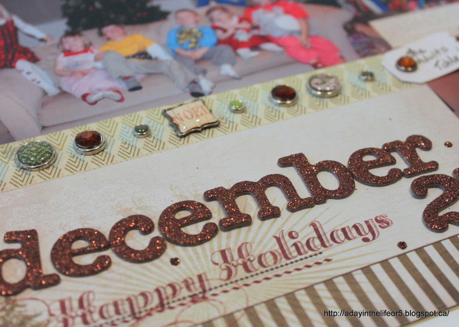 Here’s a close up of the row of brads I added to the title block (above) and then (below) I added brads to the centre of some of the garland images on the journaling tag. Only one of those brads was from a Christmas collection. Man it feels good to use a pile of stash items on a layout!! I think I am really going to like the new Scrap Your Stash series at Two Peas!