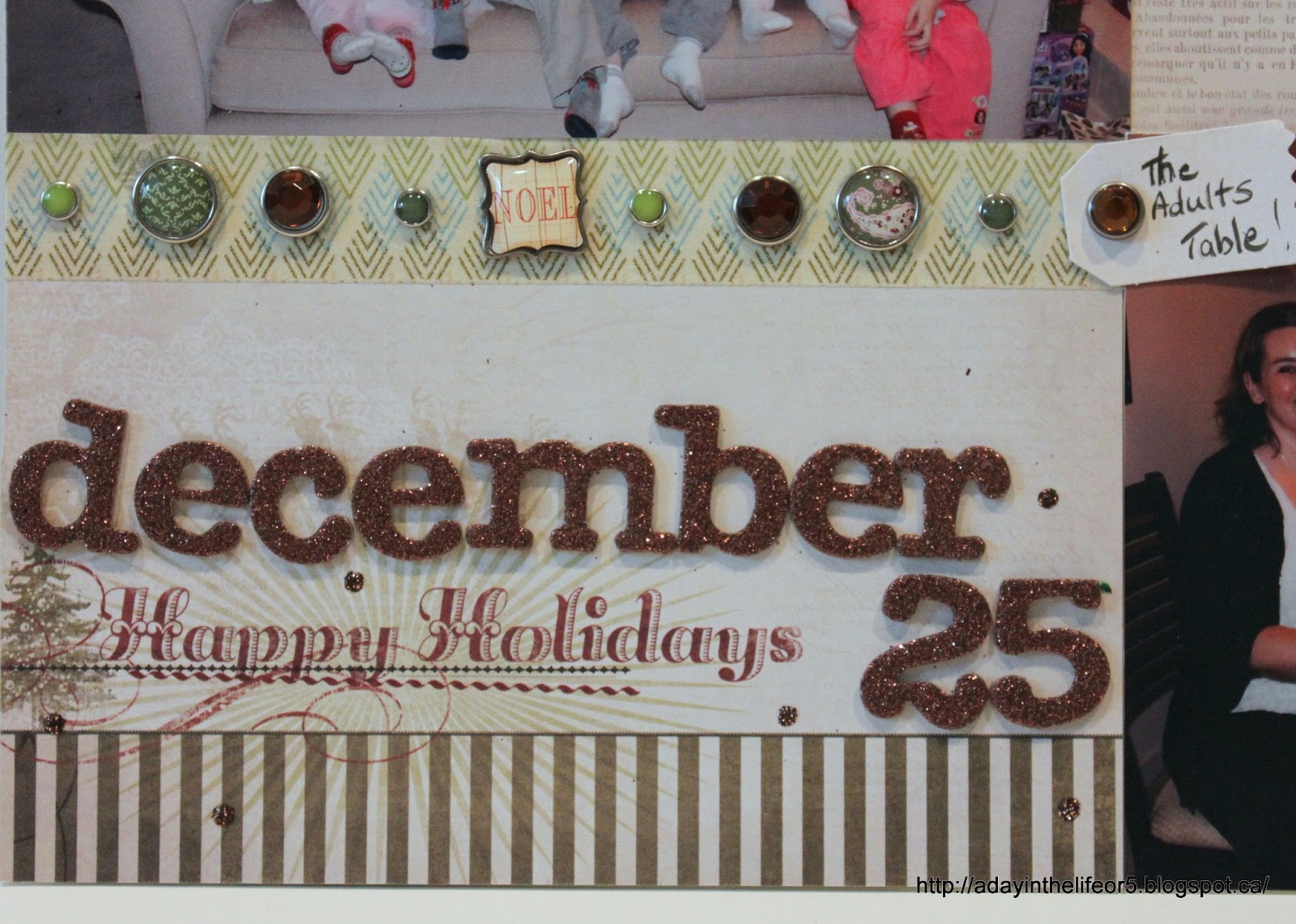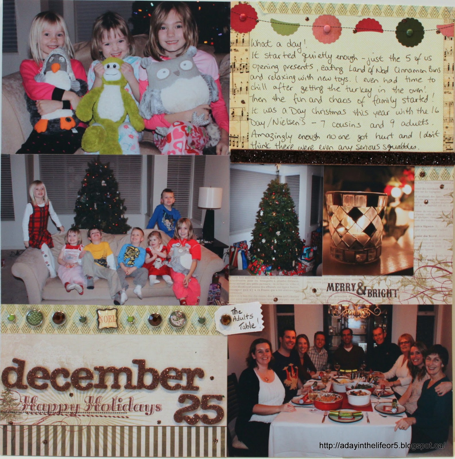 I like the recap feel to this layout. A couple smaller shots of our decor and then the highlights from the day – new stuffies, all the Day/Nielsen cousins together and the adults Christmas Dinner table. The kids are getting old enough that things are starting to feel almost civilized!