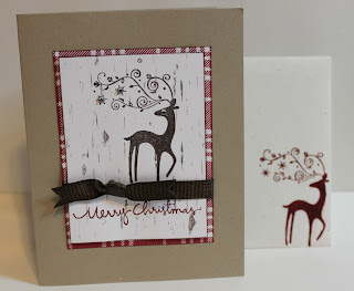 I stamped Dasher in Early Espresso on some Frostwood Lodge birch bark looking DSP then stamped the Merry Christmas sentiment underneath in Cherry Cobbler. I mounted that onto another piece of Frostwood Lodge DSP (this time a red plaid) using dimensionals, tied a piece of Early Espresso Quilted Satin ribbon around the whole thing and mounted in onto my Crumb Cake card stock.