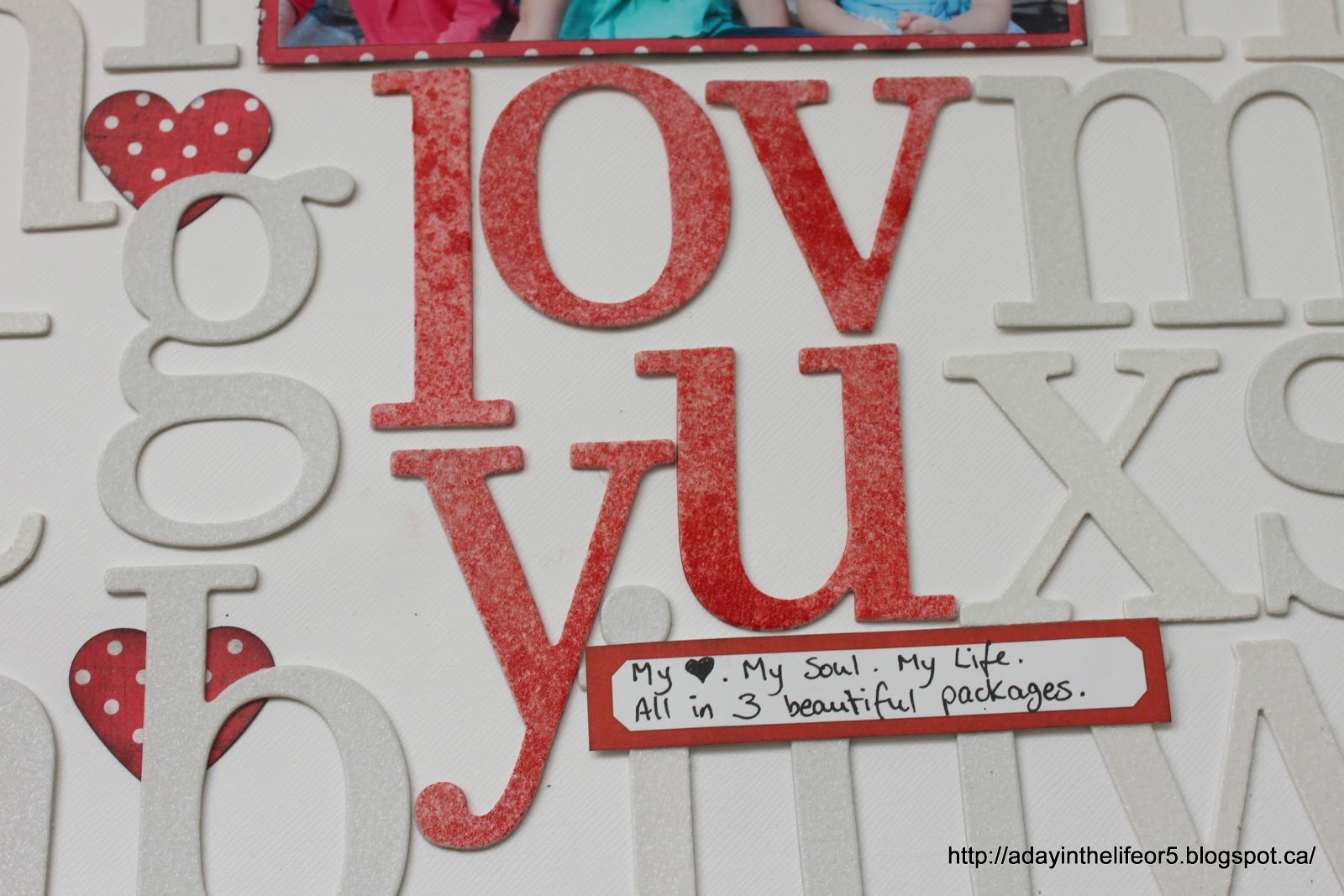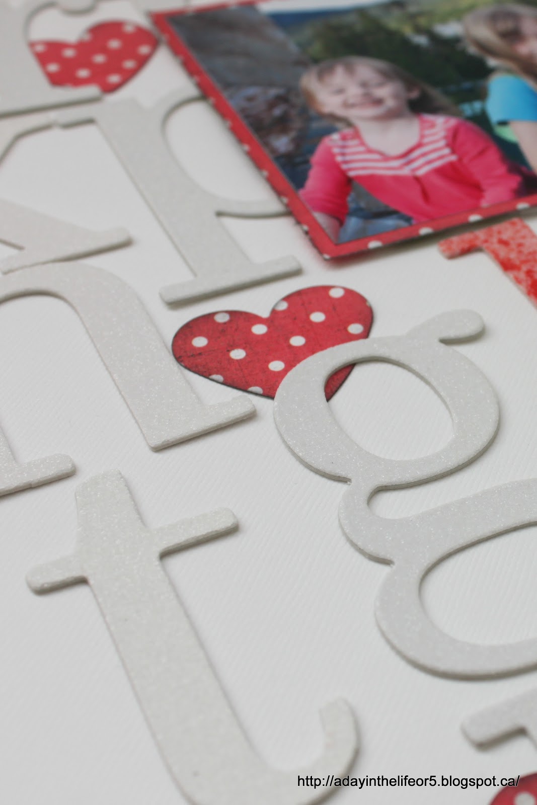 During my pre-garage sale purge I found a few packs of these large glittery white alphas. One was complete and unopened so it went into the garage sale pile but the incomplete ones stayed in my stash. I pulled them out for this layout and prayed I had the letters I needed. Well … I had almost all the letters! I took the L, O, V, Y and U and sprayed them with a couple different Mister Huey’s to get a reddish pick colour. It’s a pretty close match to the patterned paper which was my goal. I wanted all the design elements (photo, title and journalling) to read as one block in a sea of white alphas.