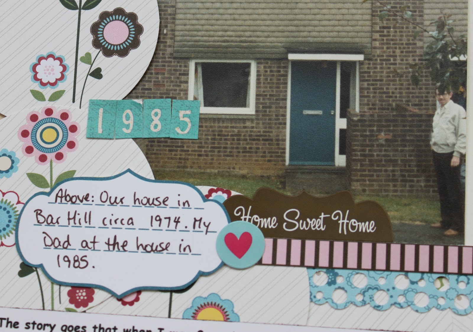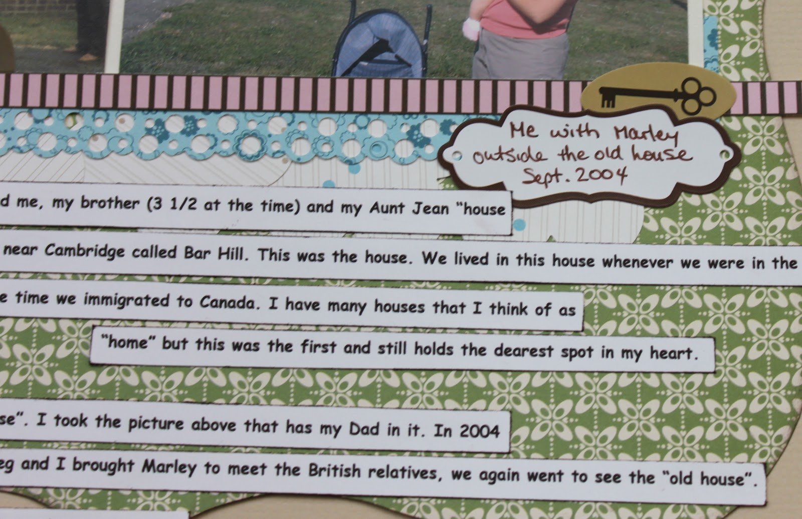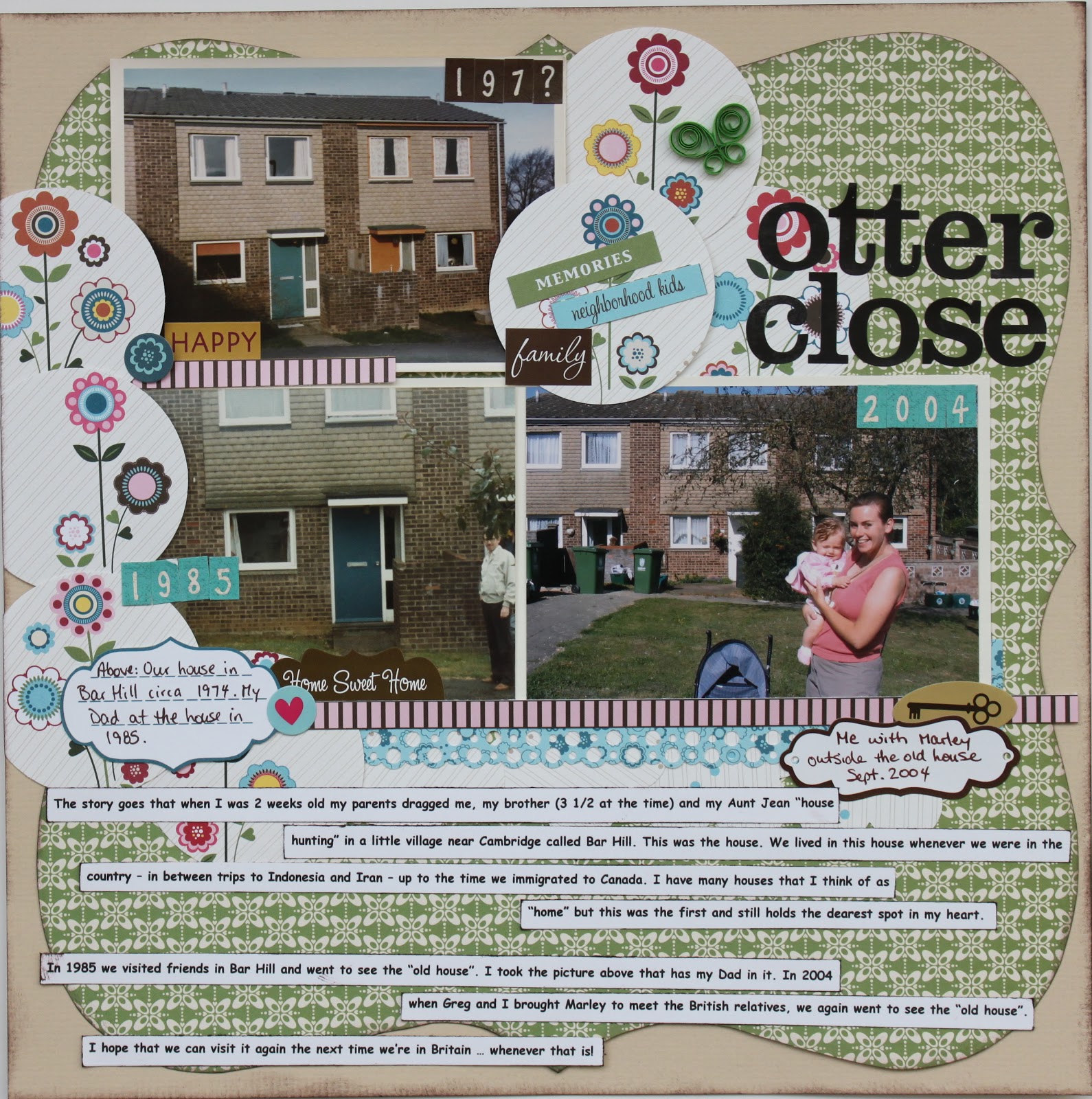 The journalling kind of tells it all so here it is: “The story goes that wen I was 2 weeks old my parents dragged me, my brother (3 1/2 at the time) and my Aunt Jean “house hunting” in a little village near Cambridge called Bar Hill. This was the house. We lived in this house whenever we were in the country – in between trips to Indonesia and Iran – up to the time we immigrated to Canada. I have many houses that I think of as “home” but this was the first and still holds the dearest spot on my heart. In 1985 we visited friends in Bar Hill and went to see the “old house”. I took the picture above that has my Dad in it. In 2004 when Greg and I brought Marley to meet the British relatives, we again went to see the “old house”. I hope that we can visit it again the next time we’re in Britain – whenever that is!”