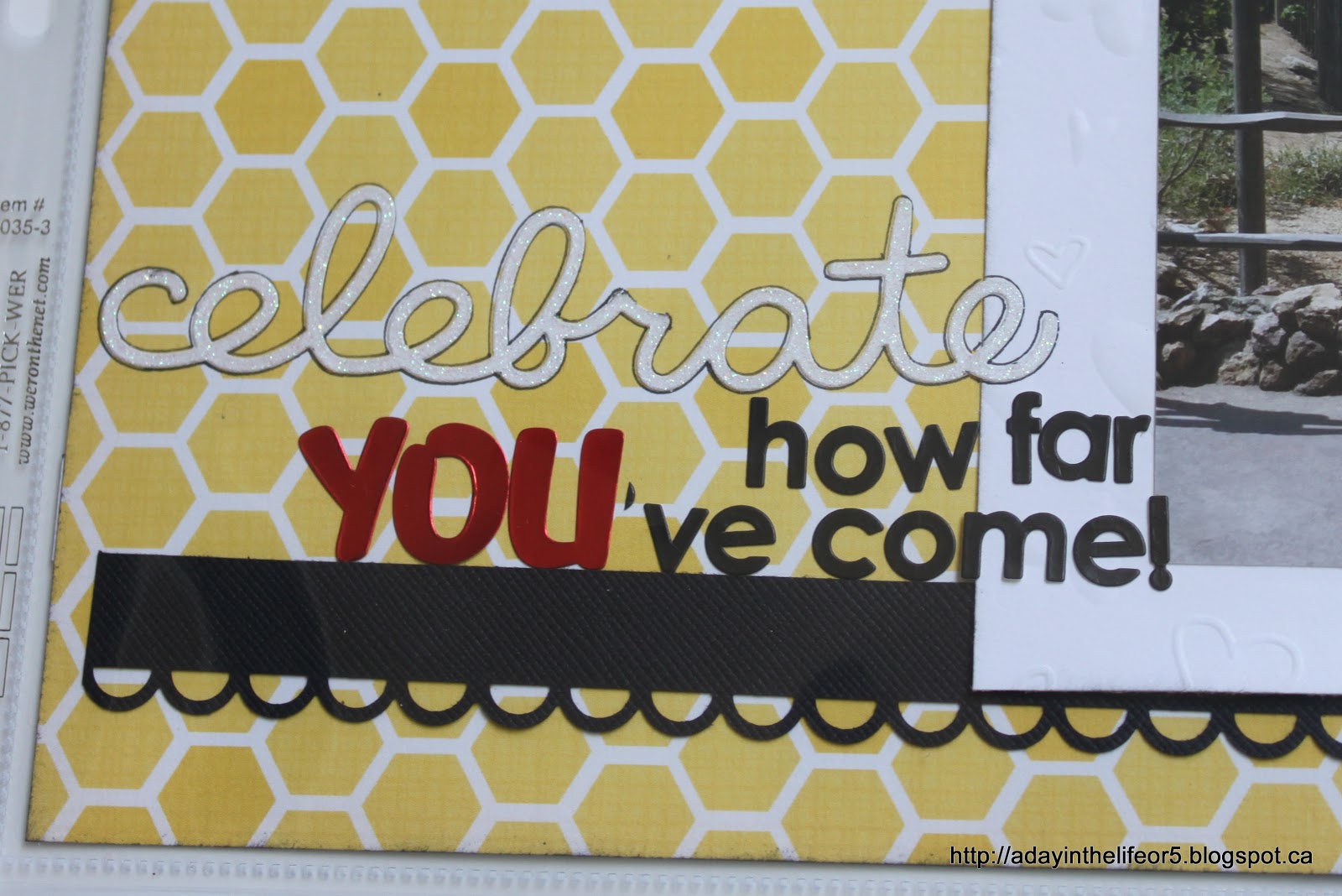 I wanted to make sure this page looked like it belonged next to the other one so I tried to use similar colours. I didn’t have anymore of the Pooh Bear paper or the yellow striped Echo Park but when I found this yellow hexagon (an older Echo Park) I knew it was serendipity! Honeycombs for a honey loving bear?! Are you kidding me? How perfect!