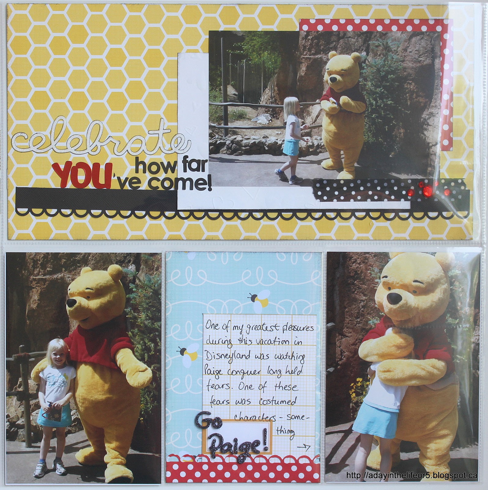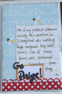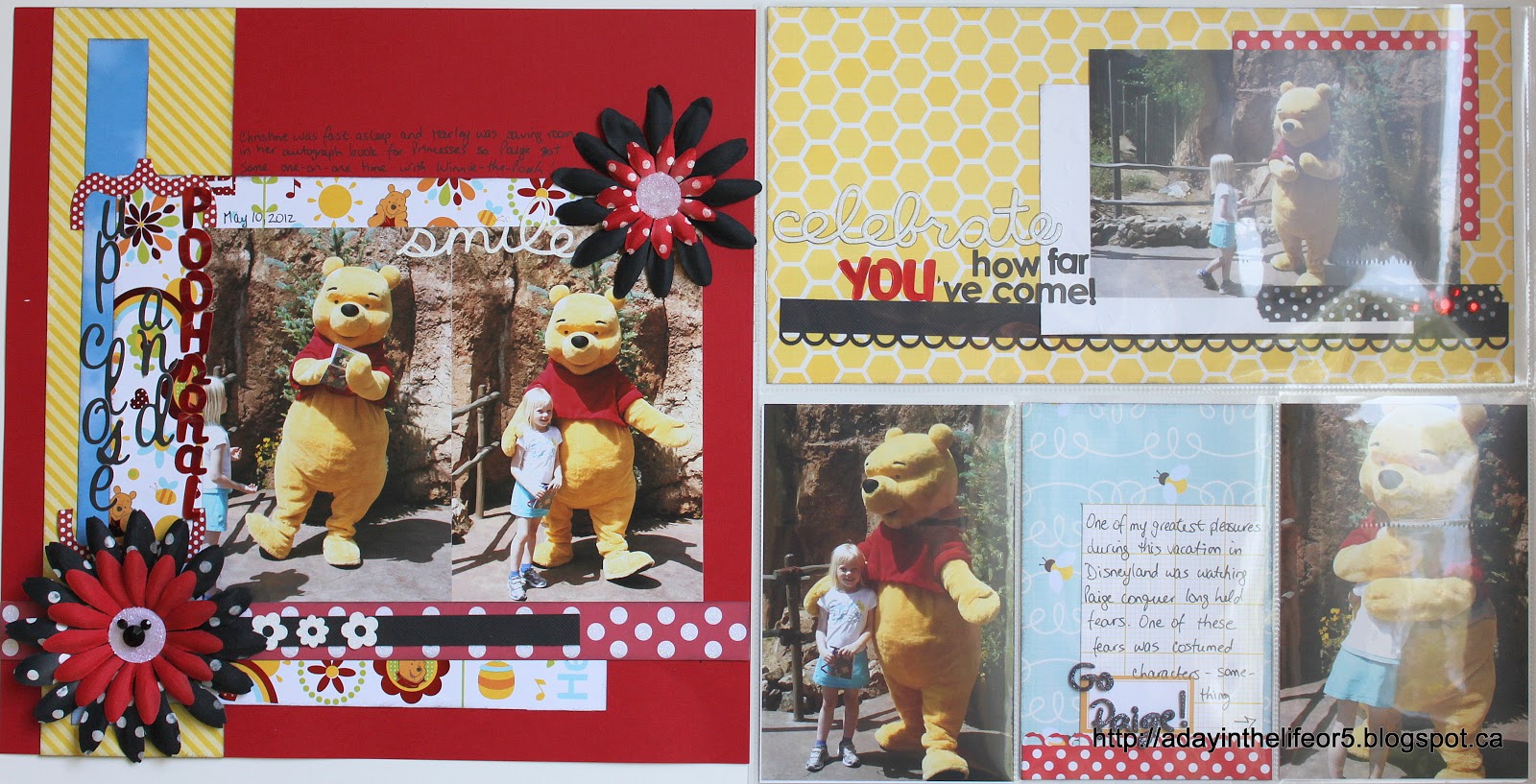 Anyway, here the story is about Paige overcoming her fears of mascots and people in full body costumes. This trip would not have been possible if Paige had been her old scared self! As I said in the post on Tuesday, Christine was fast asleep and Marley uninterested in getting Pooh’s autograph so it was just Paige and Pooh Bear. She did awesome and I am so glad I had a ton of pictures of the event and could properly celebrate this developmental milestone in my scrap book pages!!