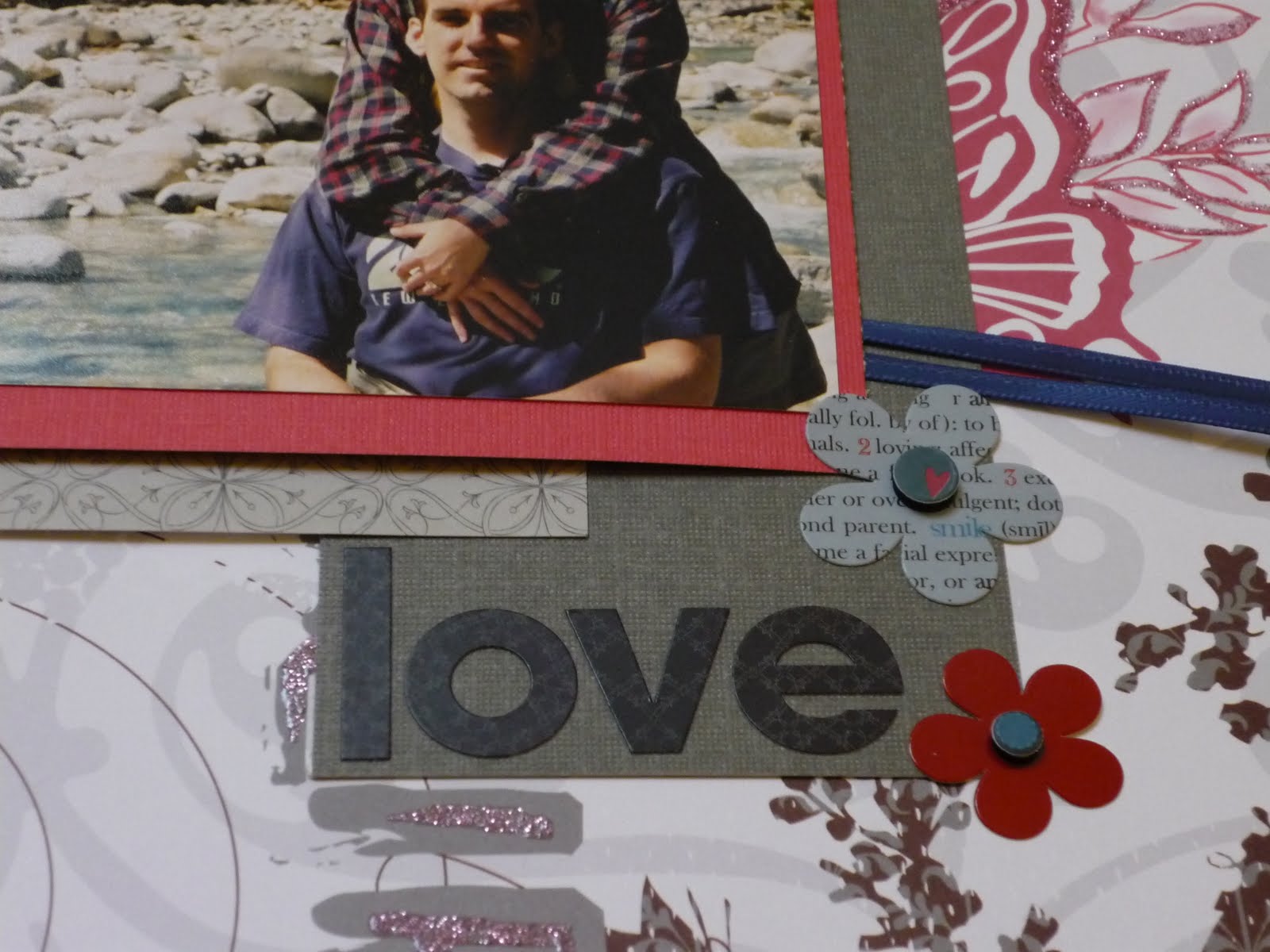 This is for the weekly Trifecta challenge over at Design Dollies. This week the challenges were to use the colours red and grey, 7 – 10 flowers and their sketch. I had come across this picture of Greg and I the other day when I was searching for something completely different – isn’t that always the way! It was taken at Lynn Canyon in North Vancouver by my cousin Crawford when he visited back in 2005. I originally thought it was pre-Marley but Greg reminded me how we were all worried about Marley and our nephew Matthew getting too close to the water. Anyway, as soon as I saw it I knew I wanted to scrap a layout but originally I thought I’d use blue to pick up on the blue shirts. Then I put it on a piece of red cardstock and loved how it looked so … the rest is history as they say. It really just was magical and I’m totally happy with the result!! Hope you like it too.