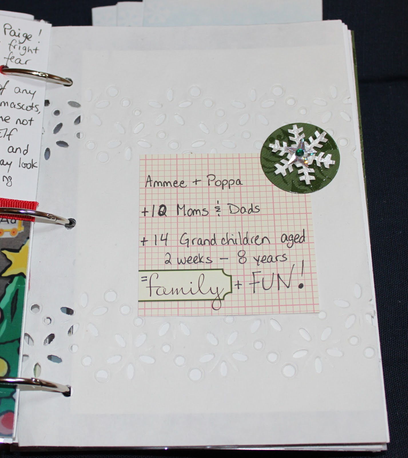 On the opposite side I included a picture of LC and her closest cousin Sadie taken during the treasure hunt. LC is holding a cookie that the kids were given from the neighbour they had to sing to for their next clue. On the main page I added a picture I took of Jonina taking a picture of me … in the snow storm! And then a picture Greg took of Poppa (Don) trying to climb over the gaggle of grandkids that decided to congregate on the landing!!