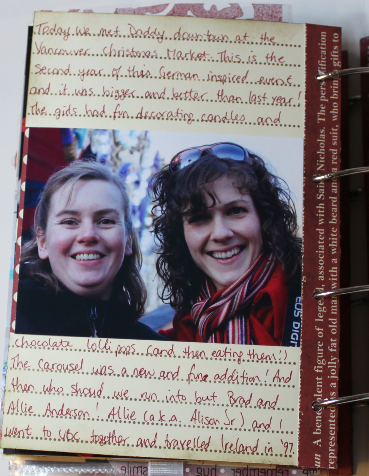 On the back I did my journalling and added a photo that Marley took of me and an old friend that we ran into. She and I were both named Alison Campbell at one time so we used to be known as Sr (that was me) and Jr. We had fun reminiscing about our Christmas spent at my Grandpa’s house in Glasgow, the Hogmanay (New Year’s Eve) in Edinburgh and the trip around Ireland. All well before we had kids!!