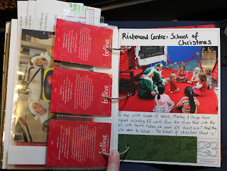 My cover page (above) is a cut down 4×6 protector page into which I’d put the tag “2 Days Until Christmas” and then added a picture of the School of Christmas sign. It was draped with paper chains made up of children’s wishes written onto “Believe” tags. That’s the mall’s theme during the Christmas Season – I Believe.