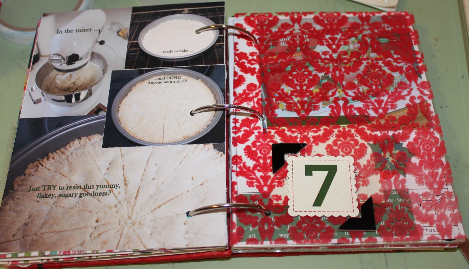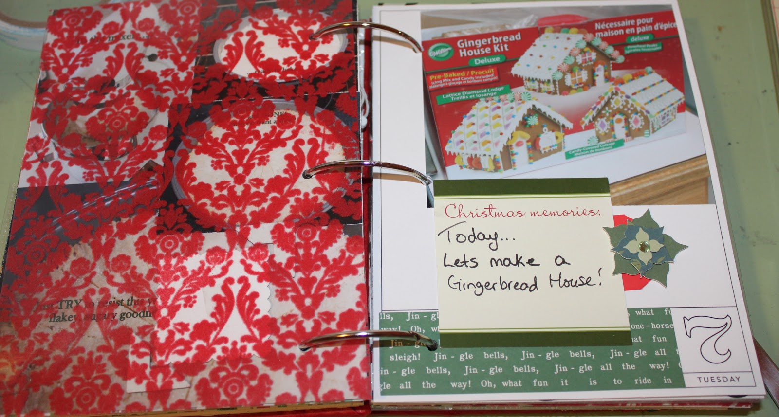 I used the note from the girls advent calendar as a place to tuck in some hidden journalling. I realize now I should have taken a picture of it … oops! You use the poinsettia embellishment to pull out the little red tag. The journalling reads: “Last year we didn’t make a gingerbread house but when I saw this kit at Michael’s, I knew we could do it this year. Marley and Paige each decorated one side of the roof. LC ‘helped’ by eating the candy and sticking her fingers in the icing. Silly girl!”
