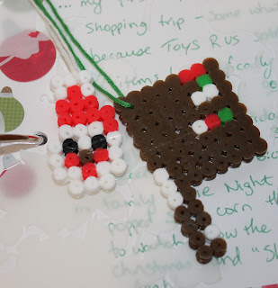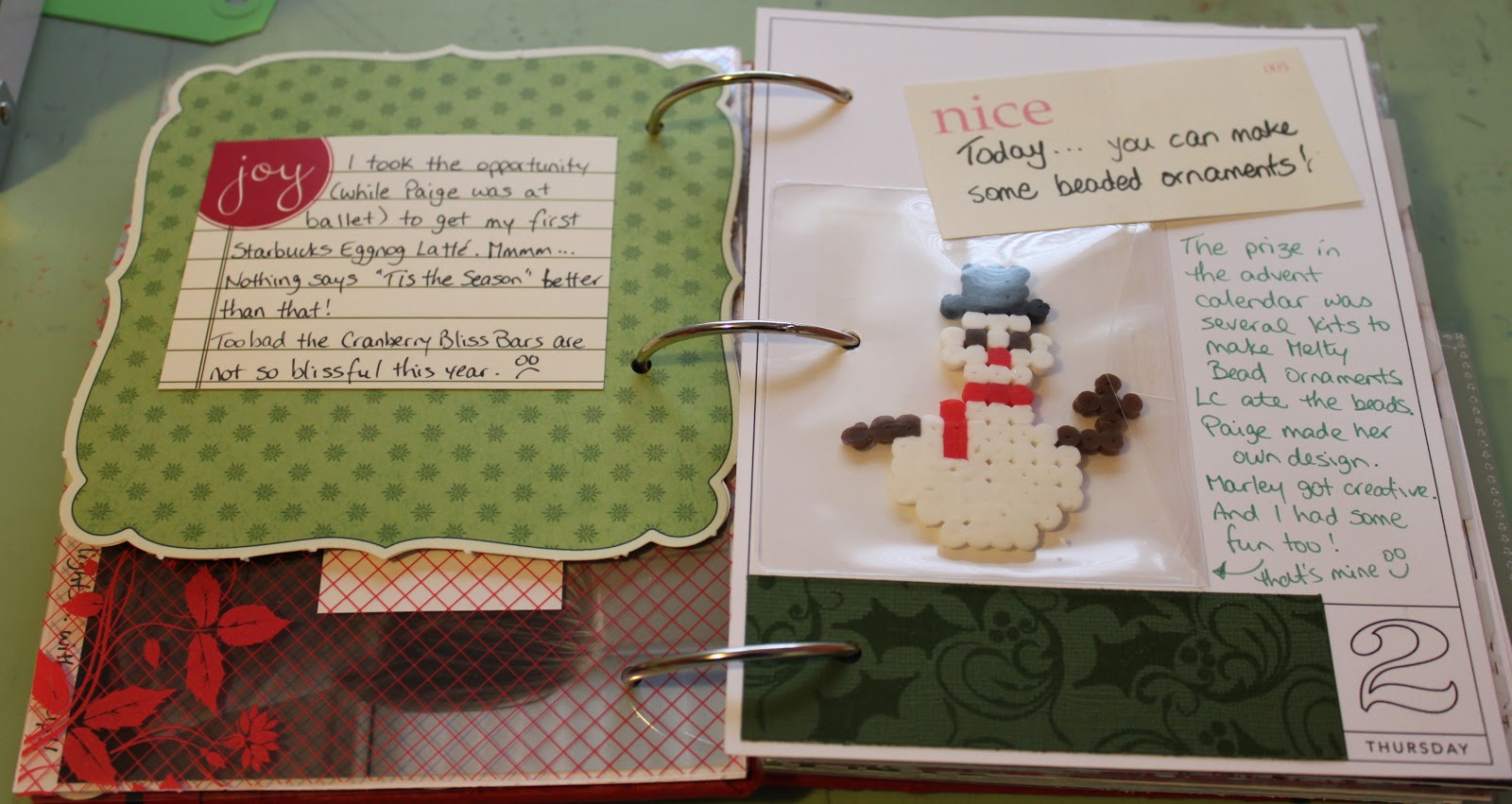 The advent calendar promised beaded ornaments and they worked so hard and made such cute creations that I just had to include them. This snowman is mine but later you’ll see a brown letter “P” and a Santa head. It was an entire Santa at one time but LC “played” with it a little too hard!