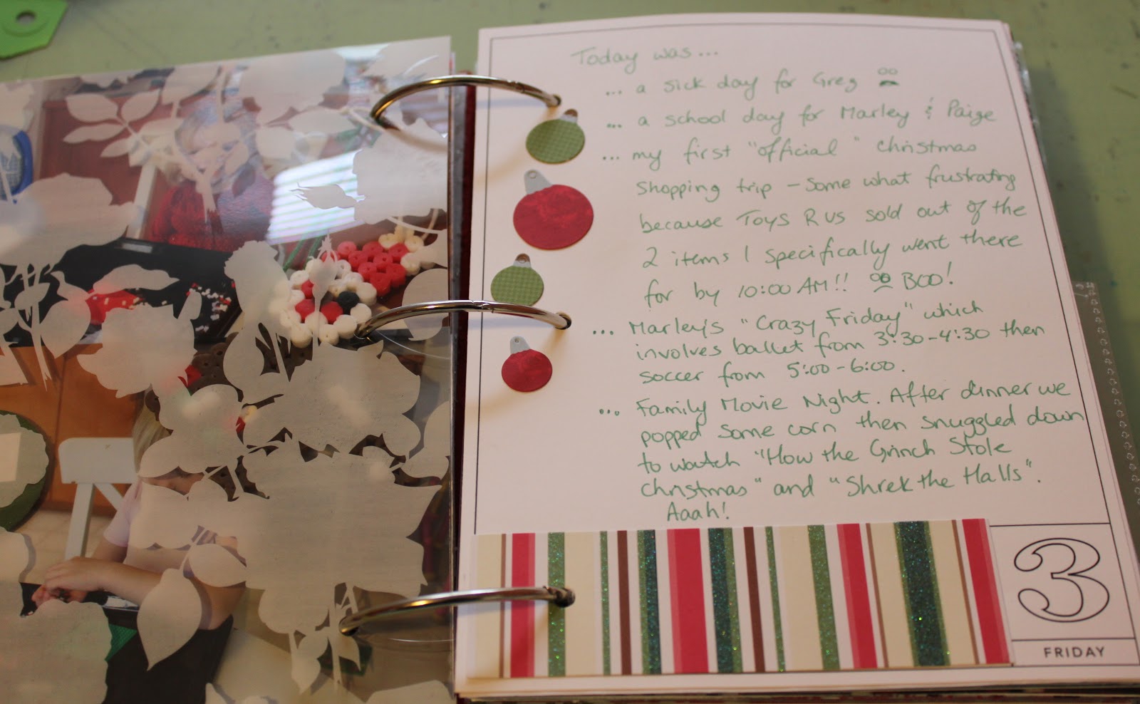 It was kind of a nothing day as we were all feeling pretty sick. Greg took a sick day from work. I did a bit of Christmas shopping. Marley had her usual crazy Friday of ballet and soccer after school. After dinner we made popcorn and watched some Christmas movies. I decided to simply journal our activities and cover the back with some matching patterned paper and call it a day.