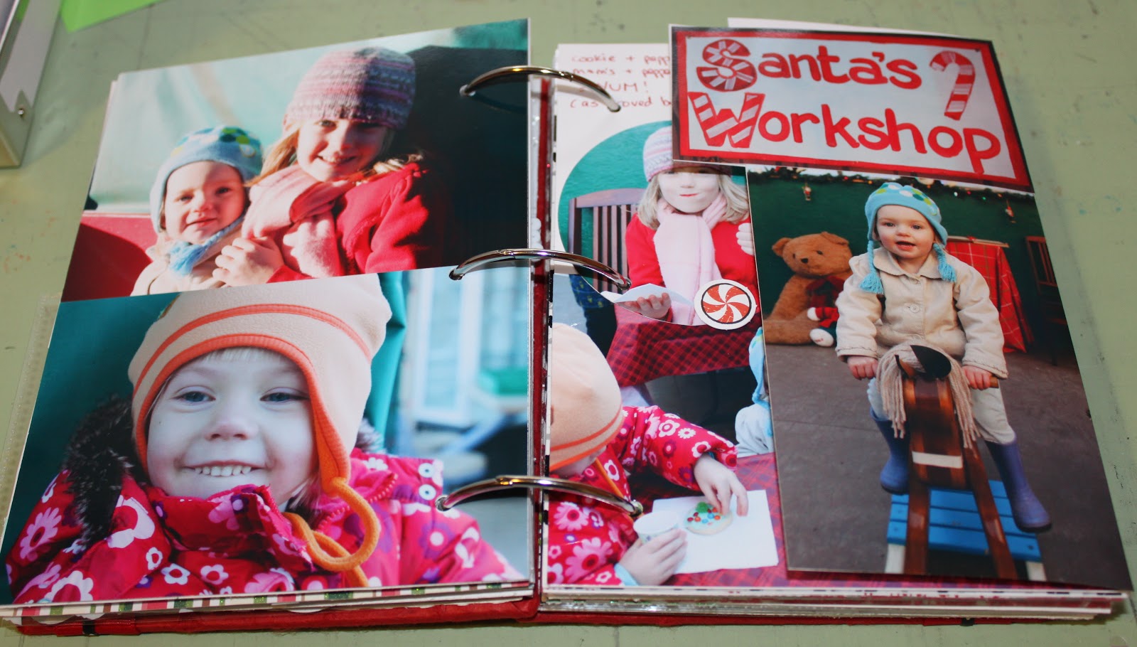 Then we arrived at Santa’s Worshop where they got to warm up, play and decorate a cookie. LC found a rocking horse and THEN she smiled! I had a lot of pictures I wanted to include (you know me and my inability to pick only one or two pictures!) so I created an extra page with this tab.