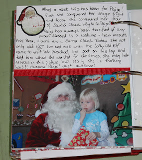 My journalling reads: “What a week this has been for Paige! First she conquered her stage fright and today she conquered her fear of Santa Claus. Way to go Paige! Paige has always been terrified of any person dressed in a costume – team mascots, PNE Bears, clowns and … Santa Claus. Today she not only did NOT run and hide when the Jolly Old Elf came to visit her preschool, she sat on his lap and told him what she wanted for Christmas. She may look nervous in this picture, but really she is thinking hard!! Awesome Paige! Just awesome!”