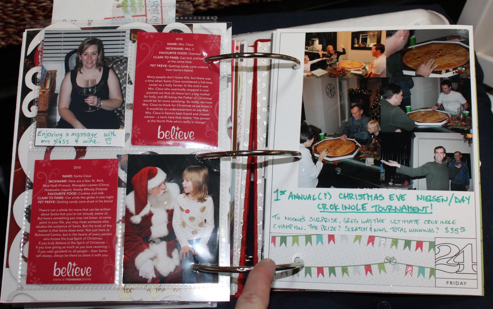 We went to the Nielsen’s for Christmas Eve. The big event was a Crokinole Tournament. I was knocked out immediately (no surprise) and Greg took the Championship (equally, no surprise there!) The prize was a stack of scratch and wins which gave Greg a total prize of $35.00!!