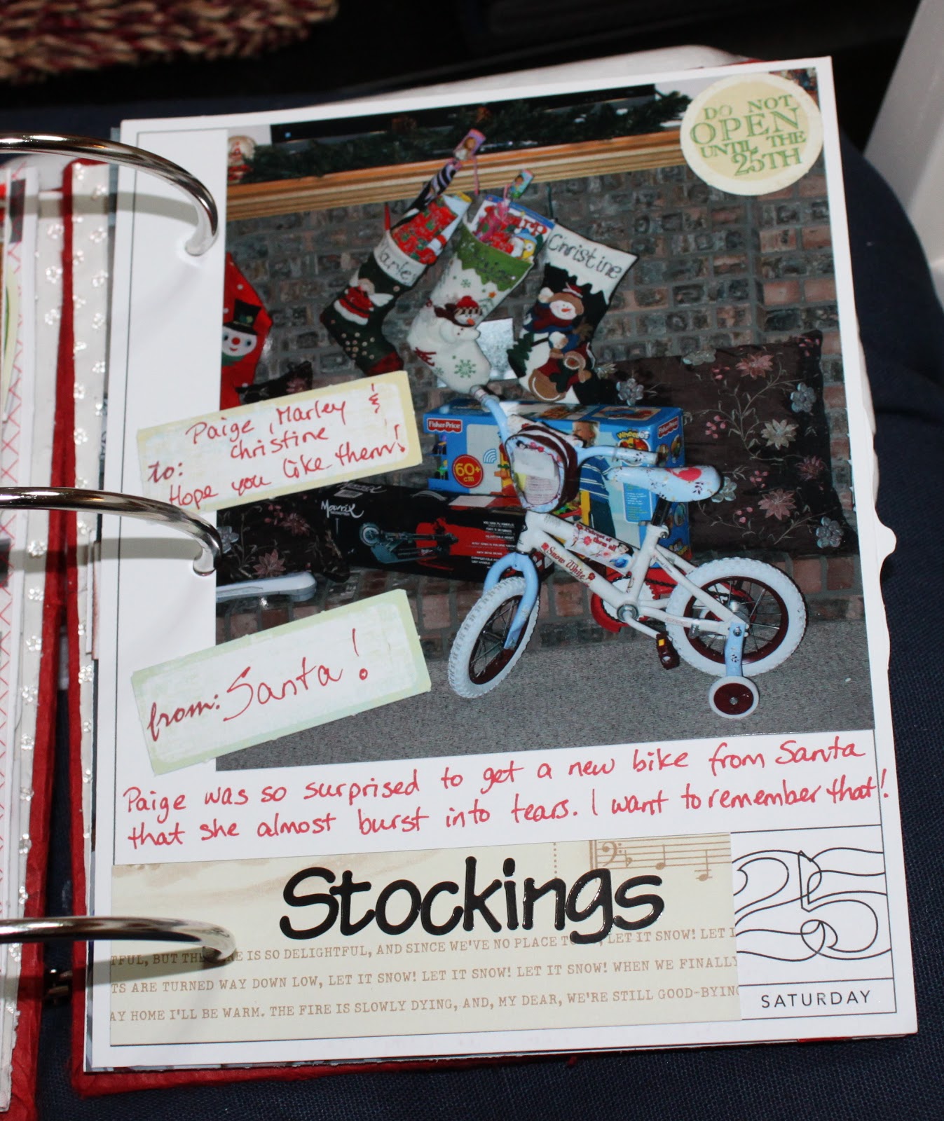 I’m not sure if I’m going to add a page for today (the 31st). Last week I thought I would but today, having finally completed Days 24 and 25 I am feeling like I want to put the album and all the Christmas supplies away. Plus, Marley has been throwing up since 4:00AM so I’m a bit tired and not feeling like partying much. We’ll see …
