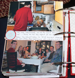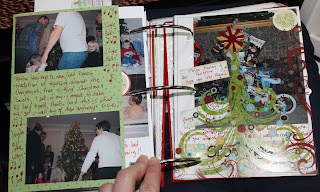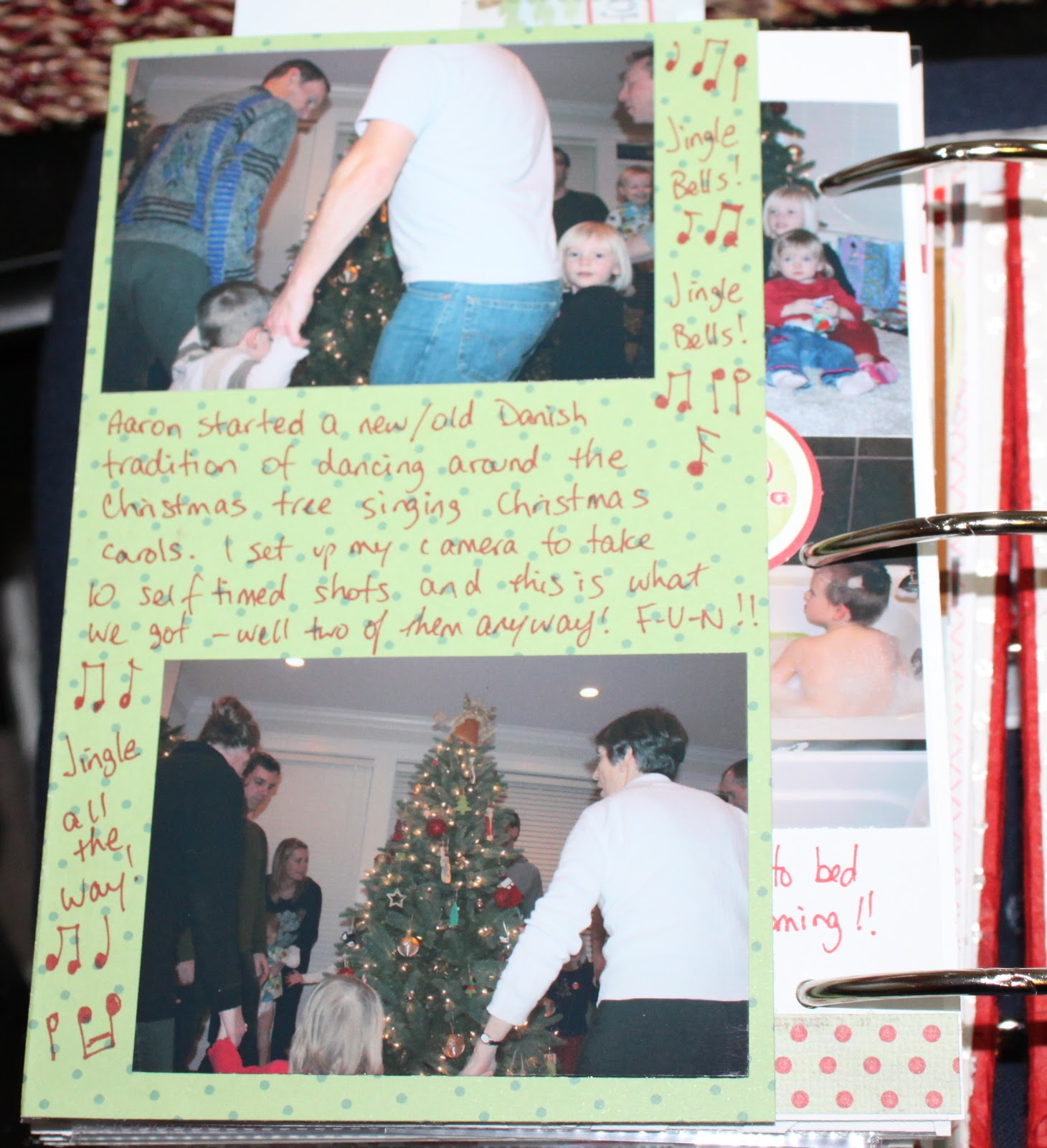 I made a flap for the back page so I could add more pictures (surprise, surprise!) Here we see a couple shots I took with the self timer (my camera has this amazing function that it will actually take up to 10 self timer shots in a row – awesome!!) It is a Danish tradition to dance around the Christmas tree while singing Christmas carols (Aaron is Danish) so we tried it this year for the first time. It was a lot of fun!