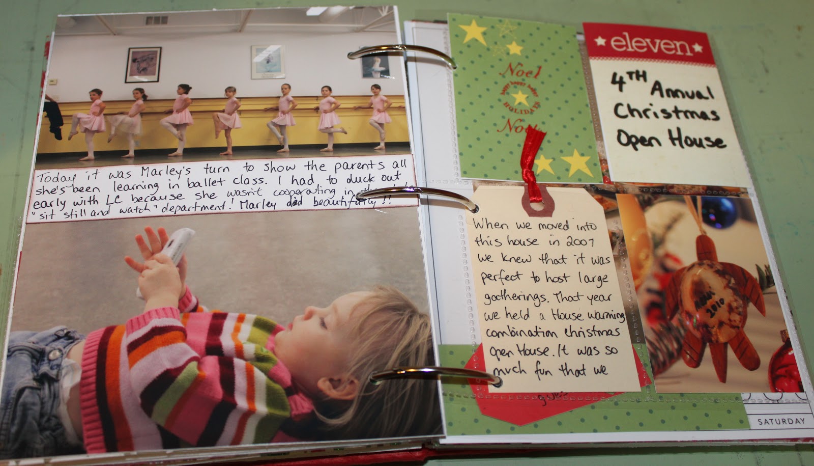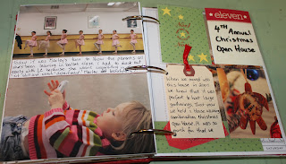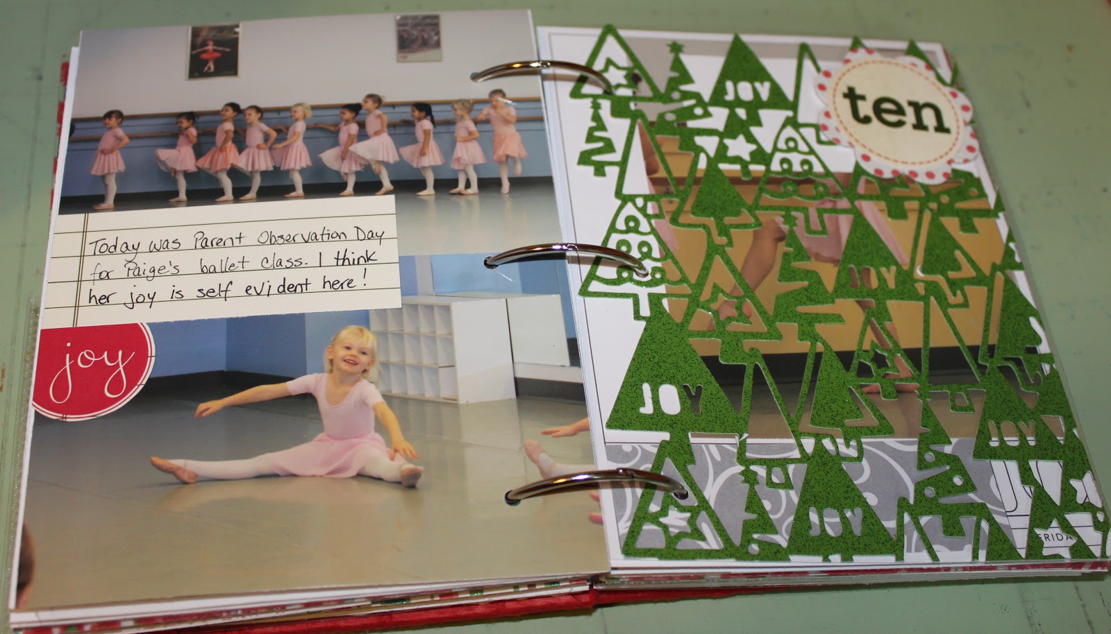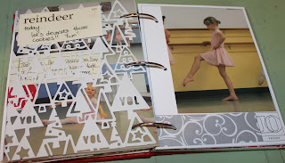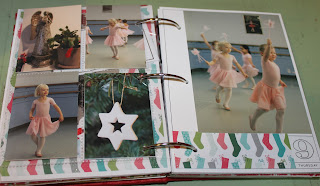 I went around the house today (Sunday the 12th) and took some pictures of random ornaments/decorations to intersperse here and later (you’ll see). I also had a ton of pictures of Paige – who could resist such cuteness?! But I learned from my Day 4 entry and only included a few. One big one on the first page, then 2 on the back. I also added a little journalling and the word ‘Joy’ as it really describes how Paige feels when she dances. She was looking pretty serious in most pictures because she was concentrating really hard, and also a bit nervous having to perform in front of all the parents, but every now and then her smile lit up her face as she forgot about us and just enjoyed the momement.