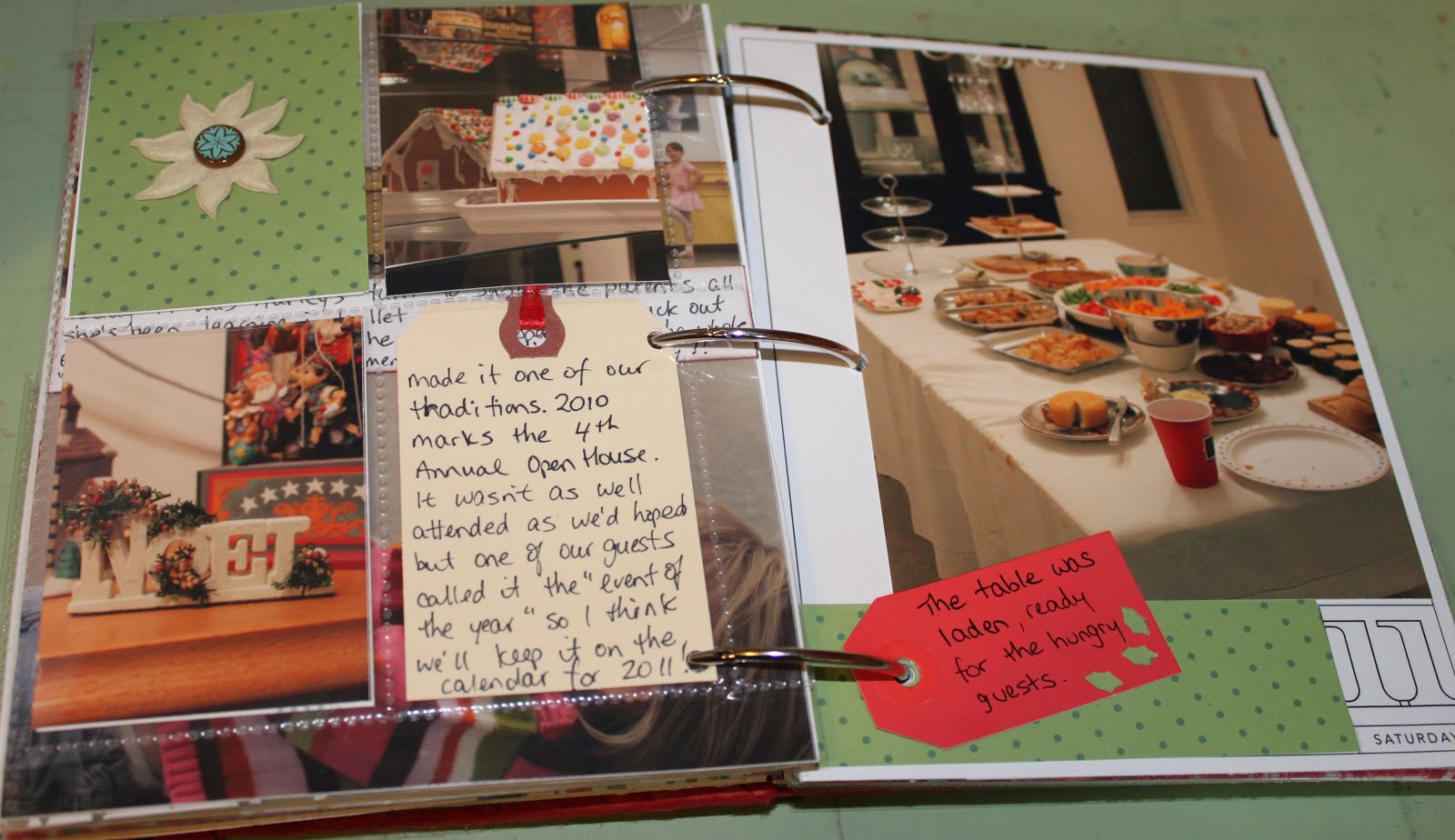 The journalling tag on the cover page says: ” When we moved into this house in 2007 we knew that it was perfect to host large gatherings. That year we held a House Warming combination Christmas Open House. It was so much fun that we made it one of our traditions. 2010 marks the 4th Annual Open House. It wasn’t as well attended as we’d hoped but one of our guests called it the “event of the year” so I think we’ll keep it on the calendar for 2011!”