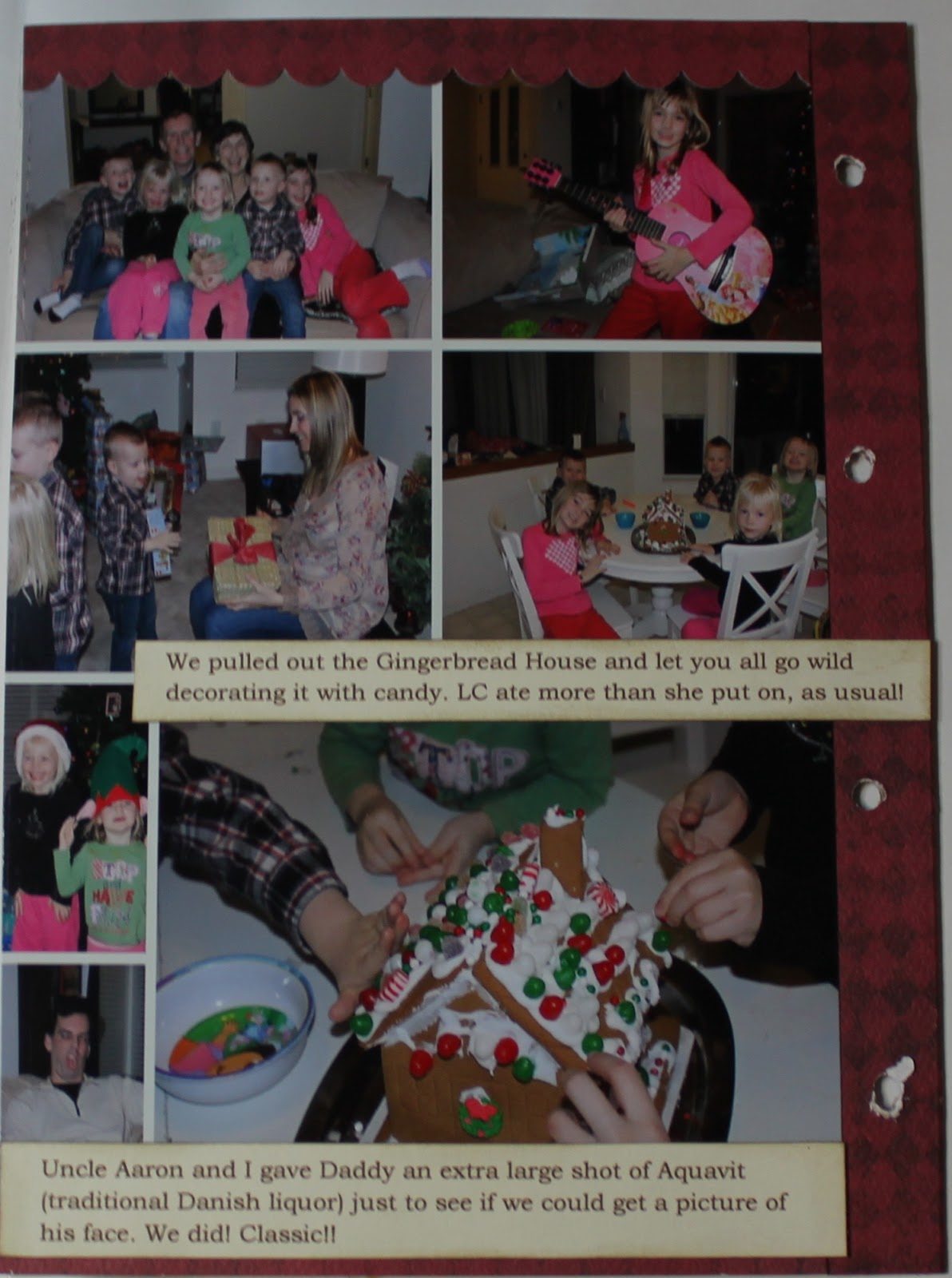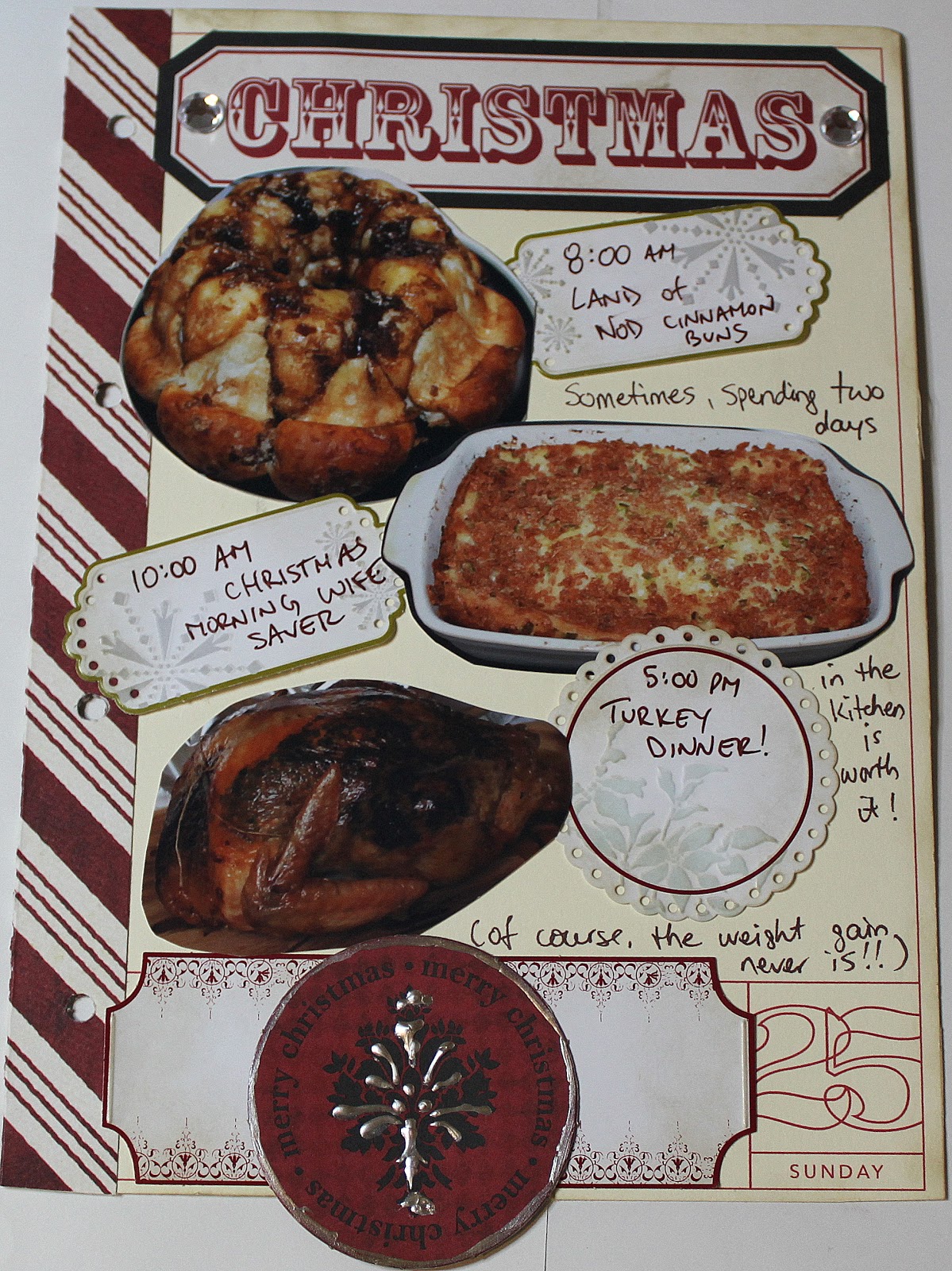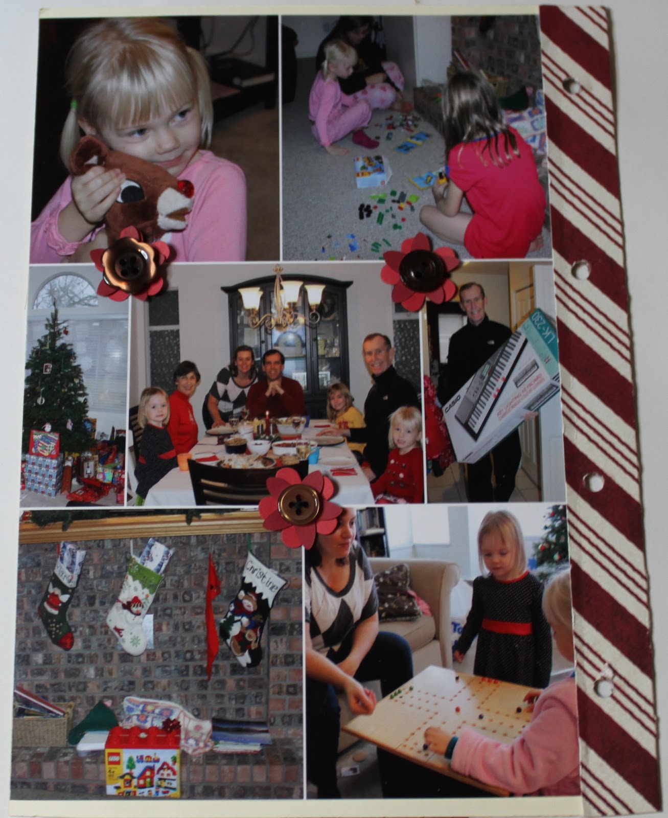 For whatever reason, I took pictures of our food this year. It seemed like I spent all the the 23rd – 25th in the kitchen so maybe it was only appropriate! For this page I feature the 3 main Christmas traditional foods we have around here. Once stockings are opened (or in this years’ case because Paige and LC slept in, before) we have the Land of Nod Cinnamon Buns from the Best of Bridge cookbook. Then mid-morning we usually take a break in the present opening to have the Christmas Morning Wife Saver (also from the Best of Bridge). Then finally, the big event – the turkey. I use a recipe from Cooking Light magazine which calls for a garlic-herb mix to be rubbed under the skin. It’s really yummy and super moist!