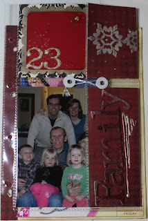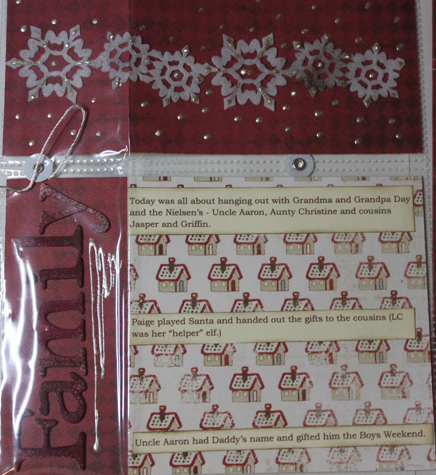 We hosted Grandma and Grandpa Day and the Nielsen’s – Greg’s sister Christine, and her family. We used the timer on my camera to take a group shot which I used in the cover page which is a flip out page protector. To the smaller flap I added the word ‘family’ – letters that were originally white but I spritzed the heck out of!! Then, since I’d used some platinum coloured Liquid Pearls on the snowflakes (see below) I added some as an embellishment below the word.