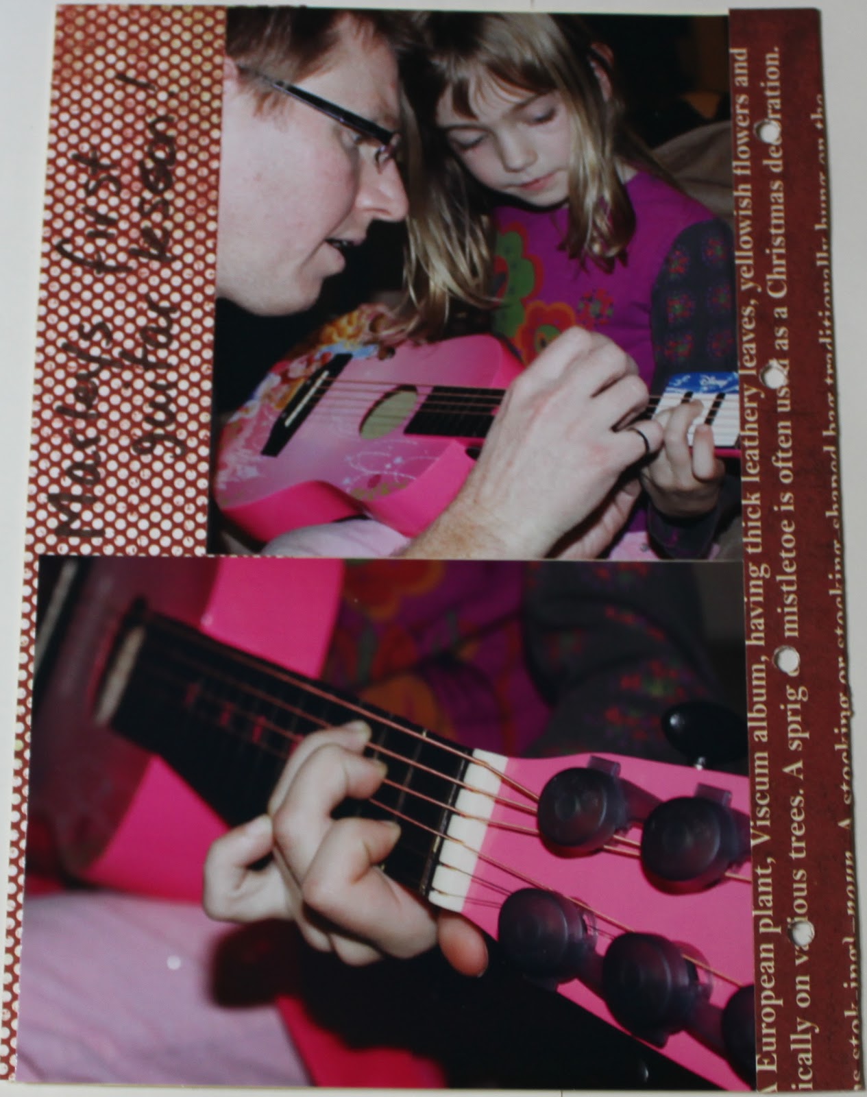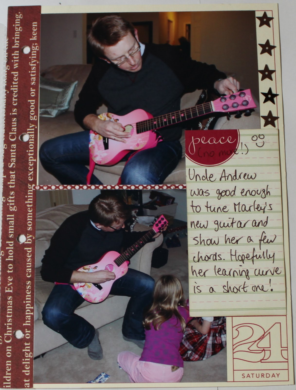 Andrew plays a mean guitar so Marley was fairly beside herself waiting for him to arrive and show her some things on her new guitar. He was awesome! He tuned it (as best he could without a tuner) and then showed her a few fingerings. The guitar came with 3 fingering charts so he used those. She was thrilled!!