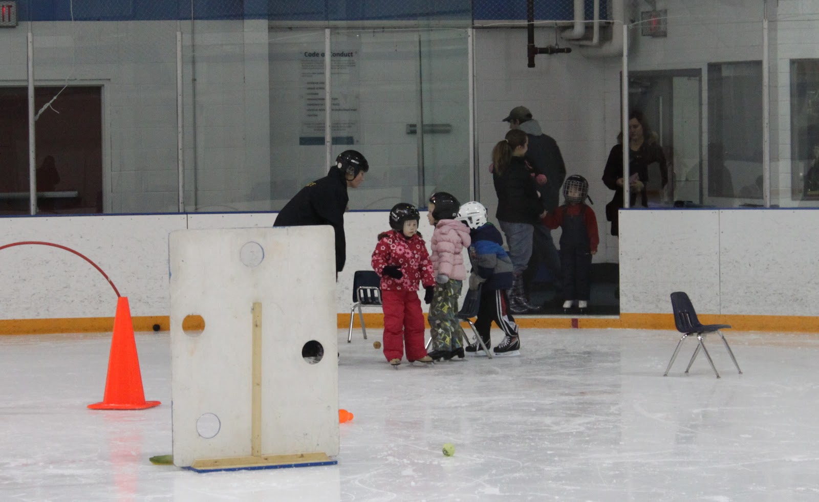 Here she is half way through the lesson. They had to pick up a toy from the pile on the ice (where the other kids are) and skate under the arch and over to the board you can see in the picture above where they were supposed to put it through one of the holes.