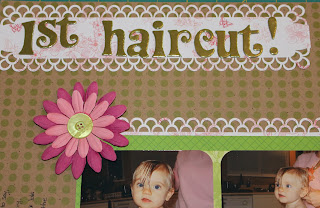 I am still completing pages for Marley’s baby album (she’s now “graduated” from Kindergarten … do you think I’ll mange to finish her album before she graduates Elementary School?!) All my kids were born with a full head of dark, dark hair so first haircuts came pretty early in their lives. Marley was a trooper and even let me cut her bangs somewhat straight!!