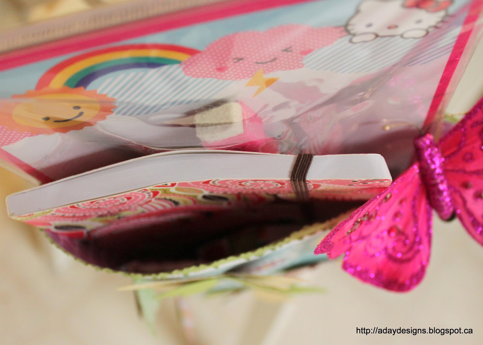 I filled the cone with school-ish related supplies – a Hello Kitty mini white board, a journal with some matching pencils and another smaller journal with attached pen. All things I knew Paige would love to have and use. She is my little artist and as such is always looking for paper to draw and write on!