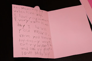 Inside she wrote: “To: Mom. Happy Valentine day. I love you so much. Every valentine day I love you more. I love you every day, every wekk (okay, we all know she means week) , every month and every year. love Marley”