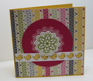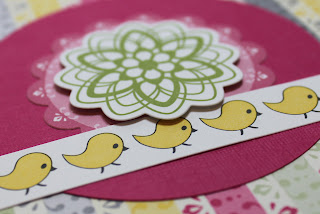 I started with a base of Daffodil Delight again but this time I made a 5″ square card. I layered a piece of the patterned paper from the Spring Fever Simply Scrappin’ kit over top. Then a 3″ circle of the Melon Mambo textured card stock from the kit which I cut out using my