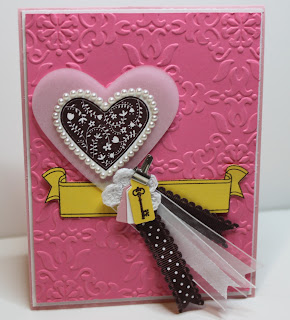 Wow, love the ribbon tail! And the embossing is so pretty, I really should use mine more! Very pretty card, hugs, Rox.
