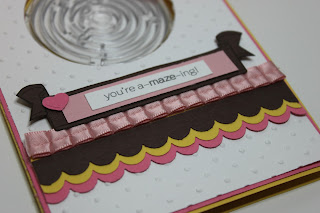 I dressed up the front of the card with layers of Chocolate Chip, Daffodil Delight and Regal Rose card stock punched using my Scallop Edge Border Punch and a piece of the 3/8″ Pleated Satin Ribbon in Blushing Bride for some textural variety and a bit a sheen.