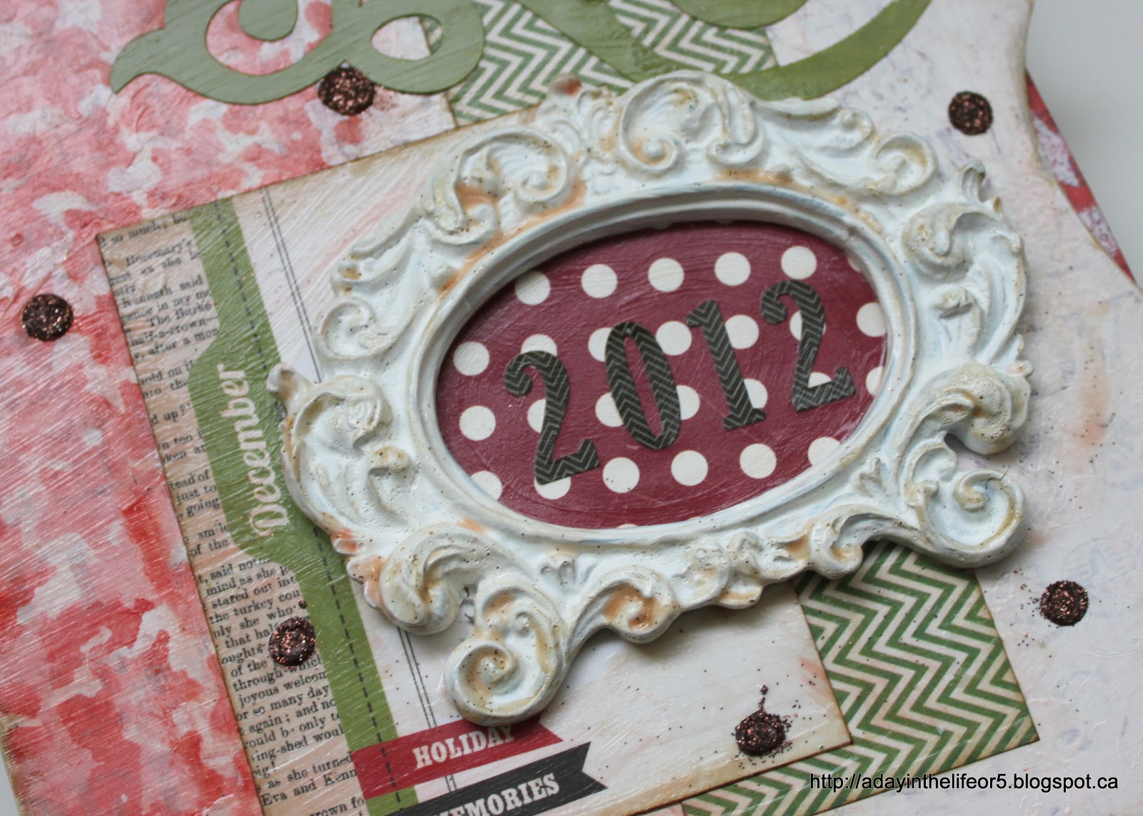 This is a close up of my cover page embellishments. I am using mostly Echo Park papers from various Christmas lines (some have been in my stash for a while so it’s time to use them up!) The frame was one I found in the clearance bin at Michael’s several months ago. It was originally turquoise but a couple coats of some white craft paint and some brown ink distressing and voila!