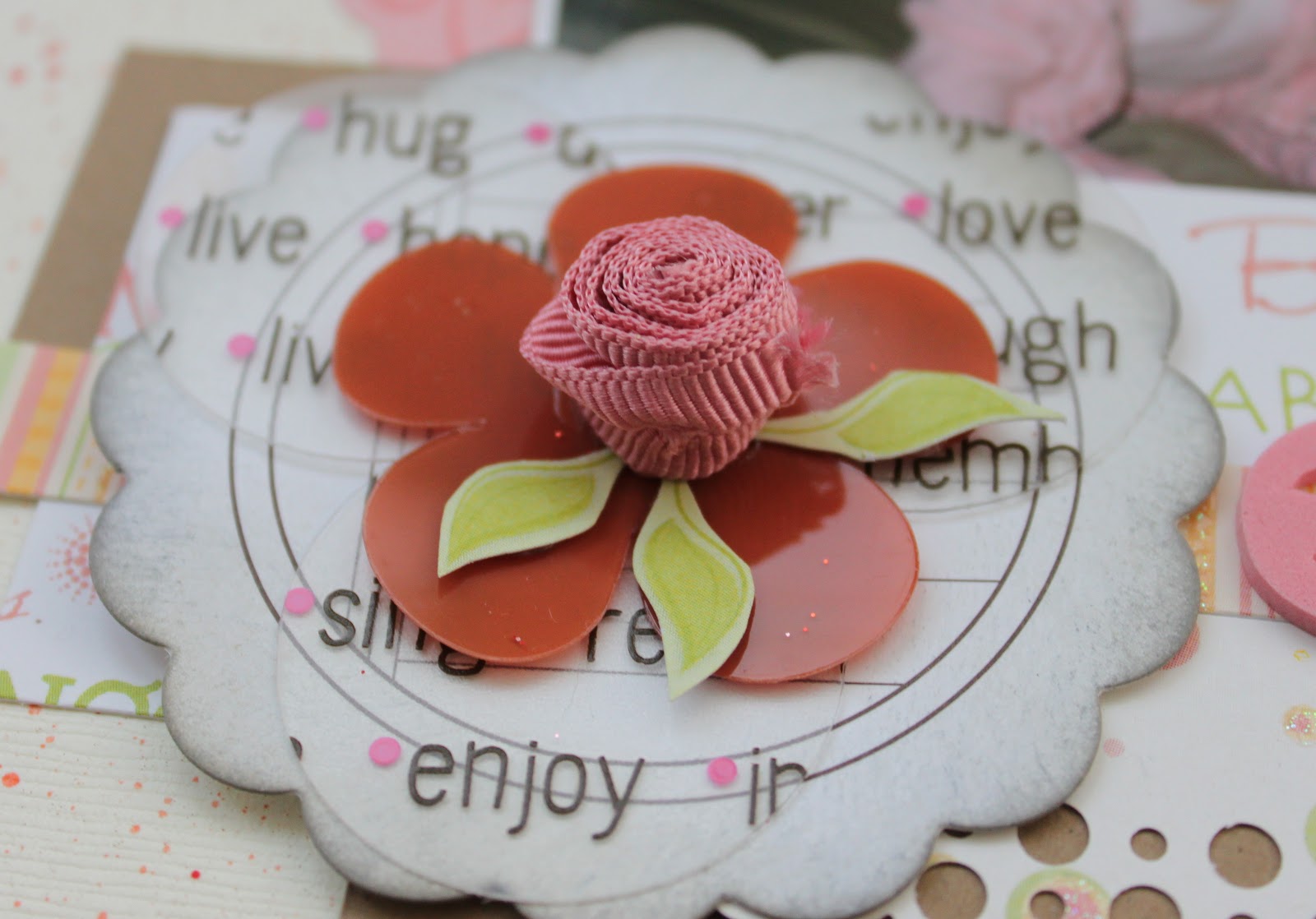 This was a fun embellishment to make. I’d punched out 3 circles from a piece of transparent paper I found in my scrap drawer intending to use them as the sketch showed but felt this corner of the layout needed something … more … if you know what I mean. So I took a Jillibean Soup journaling spot and added the circles to it. Then it needed something in the centre so I started playing with another piece of the same ribbon from the journaling block and made this little rose bud type thing. Then I knew I needed to add one of my Twelve embellishments for Family Stories and found this orange flower in my tin. It all started coming together! Once the rose bud was glued on it looked a little lonely so I cut out some leaves and added them.ย