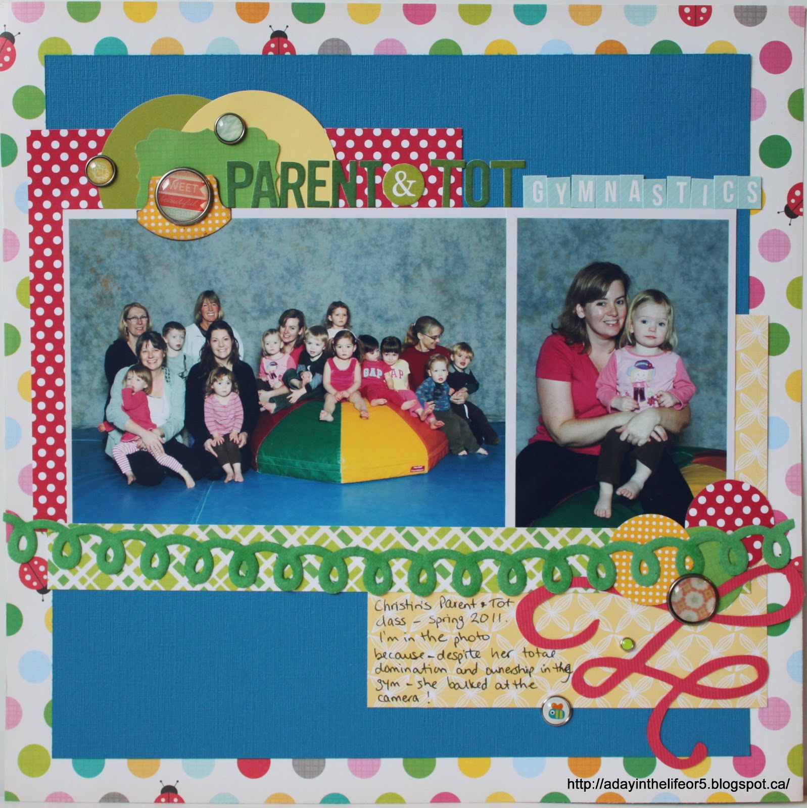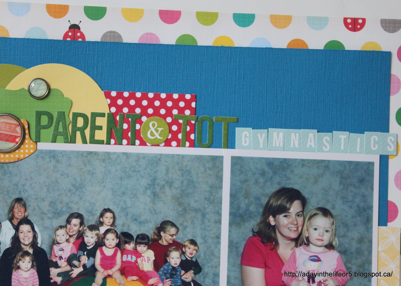 I wanted bright colours to match both the bright colours in the photo and the genre of picture (i.e. childhood activities). The bright blue card stock was my first pick and then looking for something to pair with it I came across this old Echo Park paper (Country Drive I think). I loved the fun polka dots and the lady bugs, and as a bonus, the blue complimented it well. Next I went shopping in my scrap drawer and found the red and yellow pieces to layer behind the photos as well as the green strip for along the bottom. As soon as I picked the green paper I knew I could spray the border piece to match.