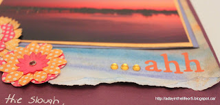 To play up on the colours of the sunset I created the piece of patterned paper you see here (the ripped one) by messily colouring lines of Gelatos, spritzing the paper liberally with water and then using my finger to blend the colours together. The rip came once the paper was dry. The original piece was too large and when I was cutting it down to size it just seemed wrong to have a straight line. So … rrrrriiiip … and voila!